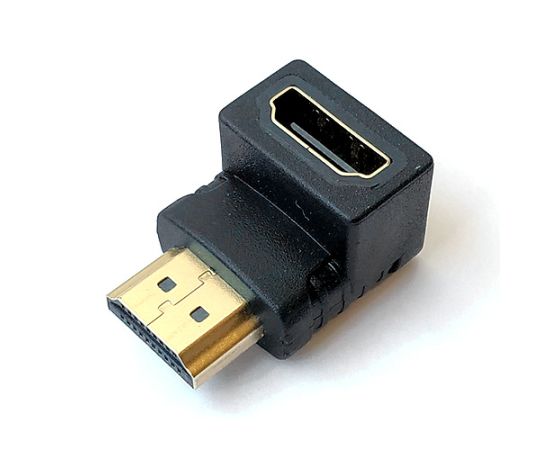 Адаптер с разъёмами HDMI AM-AF. Разъёмы расположены относительно друг друга под углом 90° вниз. Позолоченные контакты, ПВХ оболочка, цвет черный