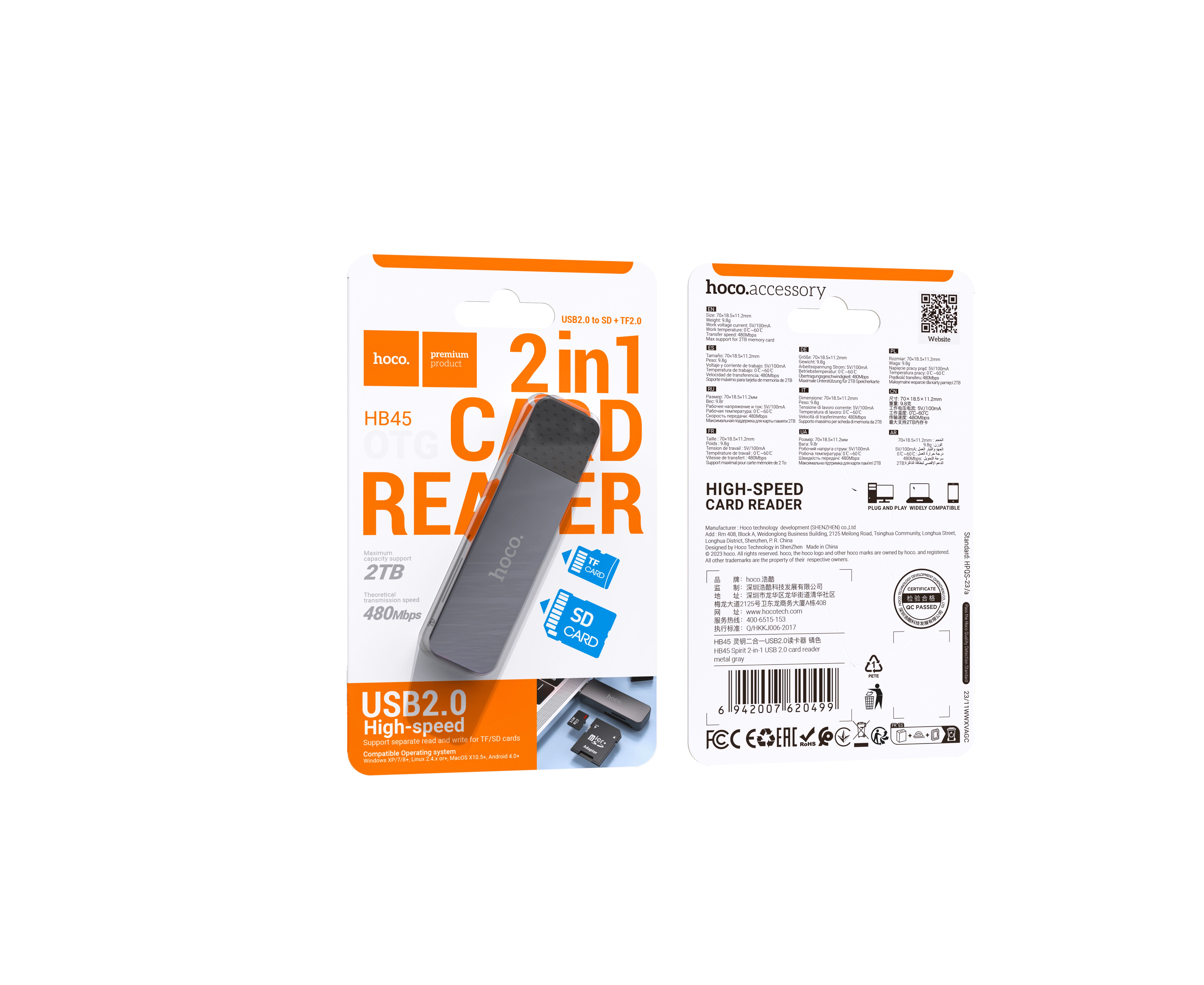 Адаптер HOCO HB45 Spirit 2-in-1 USB 2.0/SD+TF 2.0 card reader (металлически серый)