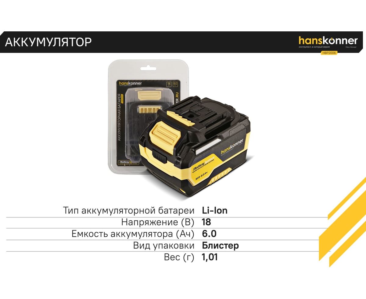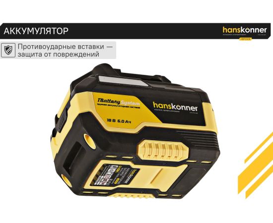 18-вольтовый аккумулятор HBP2006 Hanskonner емкостью 6.0 Ач обеспечивает впечатляющую мощность и совместим с любым инструментом единой аккумуляторной системы 1BatterySystem.