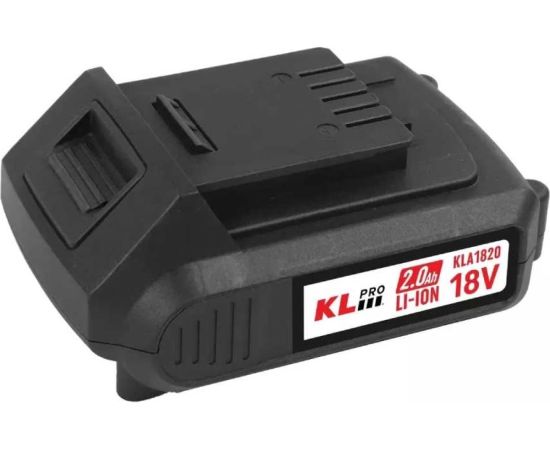 Аккумулятор Li-ion KLA1820, напряжением 18 В и емкостью 2.0 Ач, черного цвета. Тип подключения – слайдер, питание – от зарядки. Подходит для инструментов KLPRO.