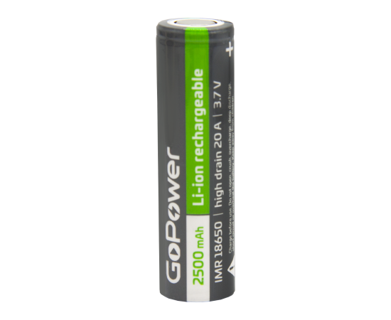 Аккумулятор Li-ion GoPower IMR18650 PC1 20A 3.7V 2500mAh без защиты выс.ток плос.конт. (1/100/400)