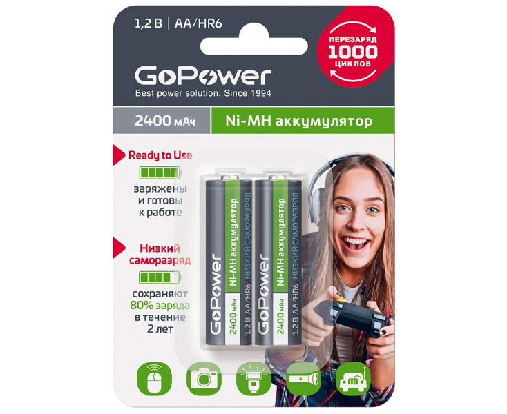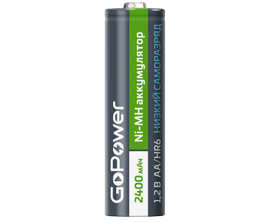 Ni-MH аккумулятор размера АА/НR6 емкостью 2400мАч. Ni-MH аккумуляторы GoPower с низким саморазрядом перезаряжаемы до 1000 раз и заменяют батарейки во всех современных устройствах. Изготовлены по технологии Ready-to-Use с использованием премиальных компонентов, поэтому поставляются уже заряженными и готовы к использованию сразу после покупки. Сохраняют до 80% заряда в течение не менее 2 лет хранения.