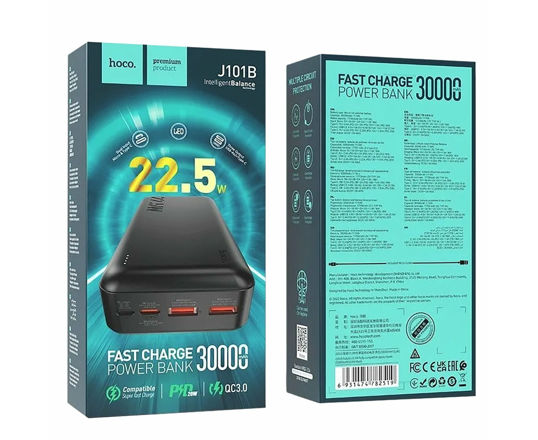 Аккумулятор внешний HOCO J101B Astute, 30000mAh, Cool, PD20 Вт, QC3.0, цвет: чёрный (1/30)