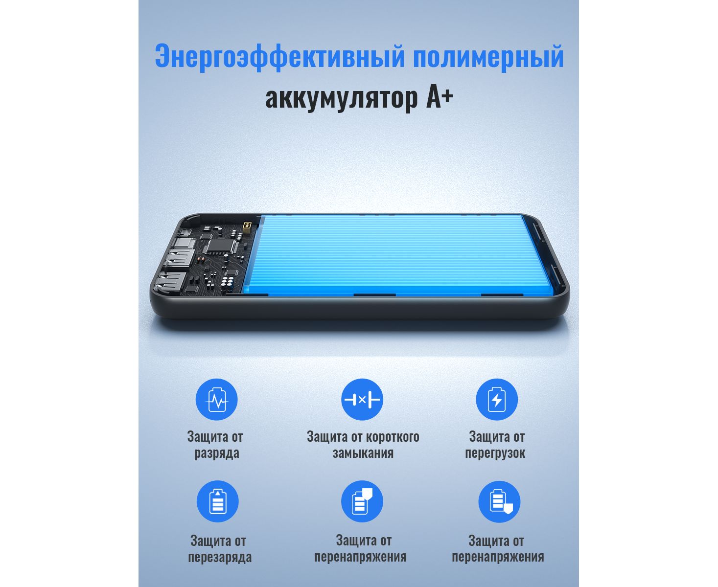 1. Ёмкость: 10000 мАч, 37 Вт·ч. Номинальная ёмкость: 5500 мАч (5 В, 2 А).