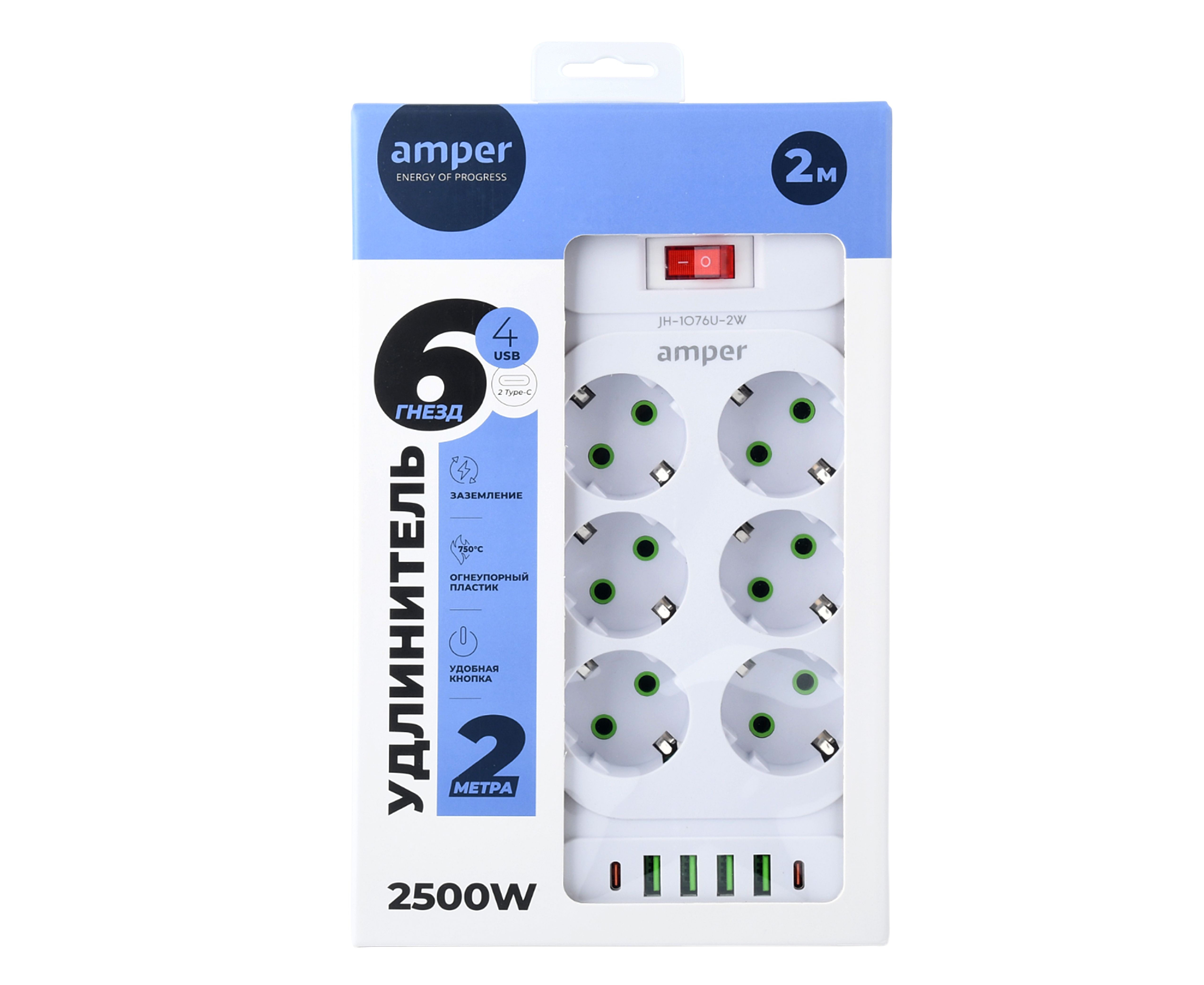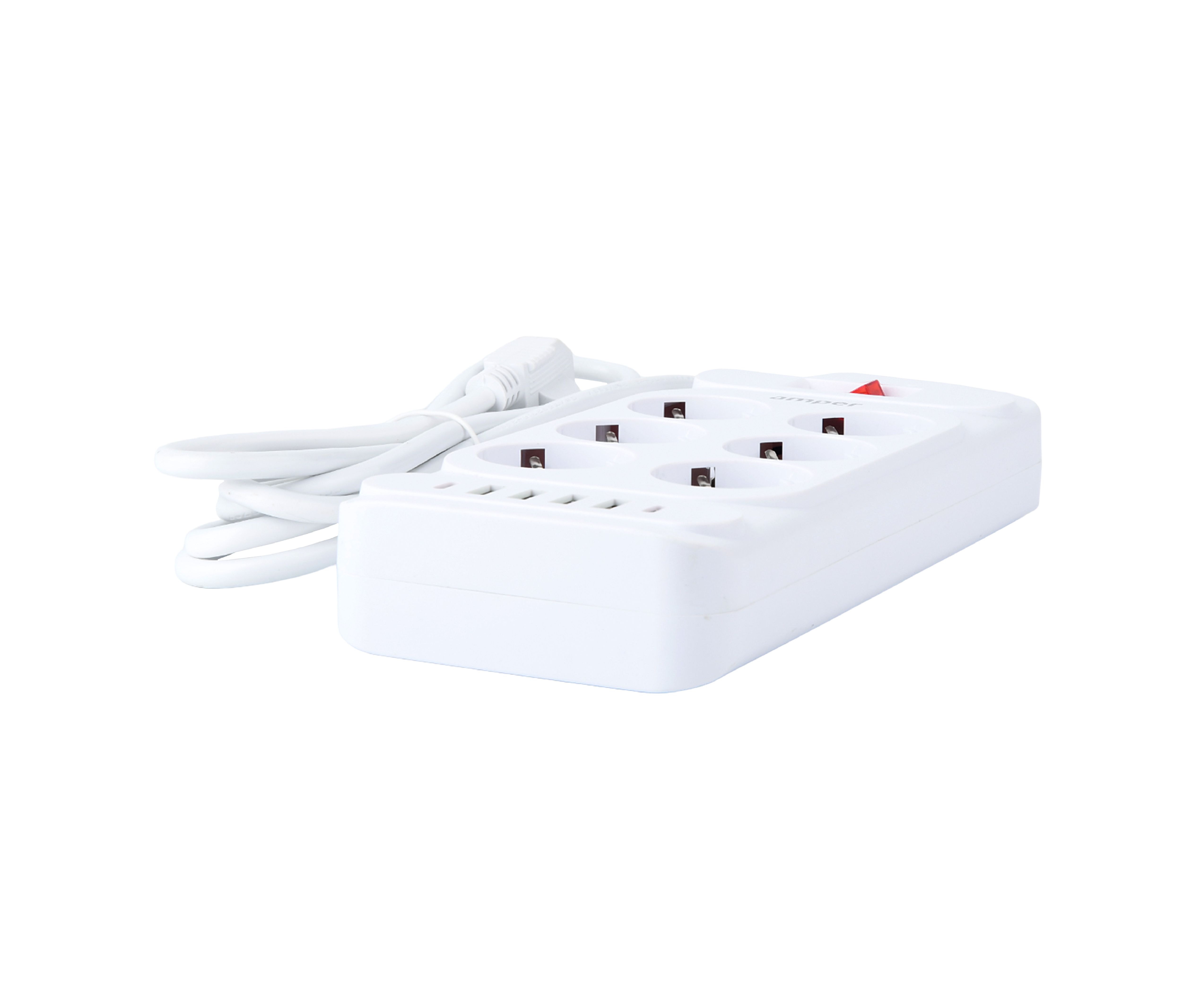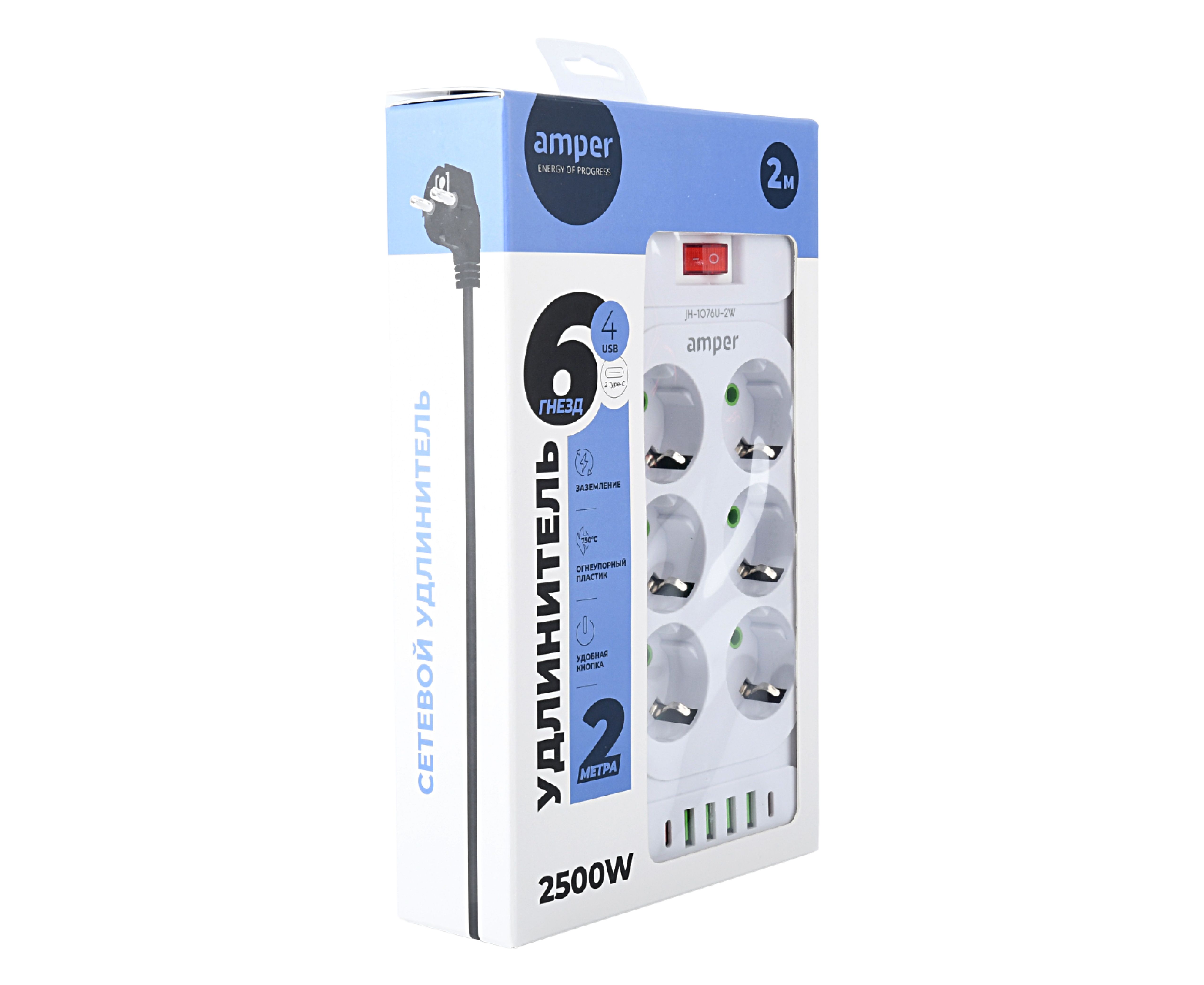 Сетевой удлинитель Amper 2,0м, 6 розеток, 10А, 2500 Вт, 4usb,2Type-C, белый