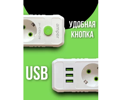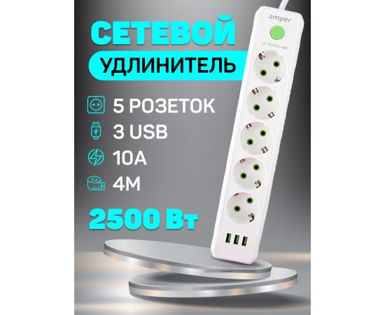 Сетевой удлинитель Amper , 4,0м, 5 розеток, 10А, 2500 Вт, 3usb, белый