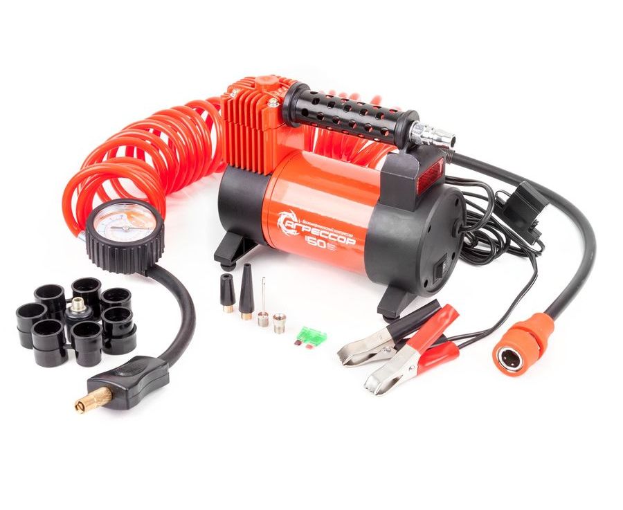 В шланг встроен манометр и перепускной клапан, переходники для накачивания лодок, матрасов мячей и велосипедных шин, сумка