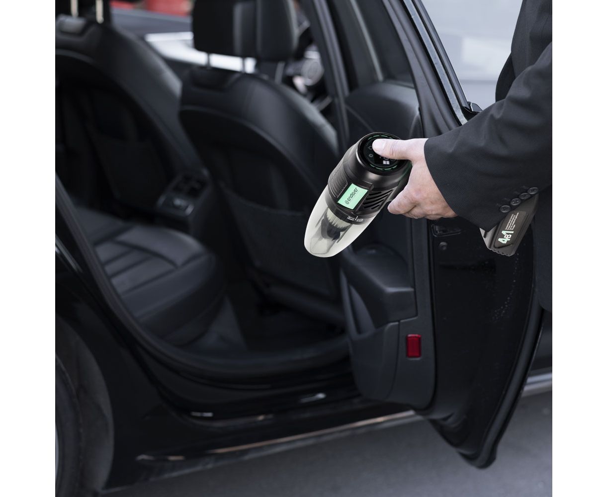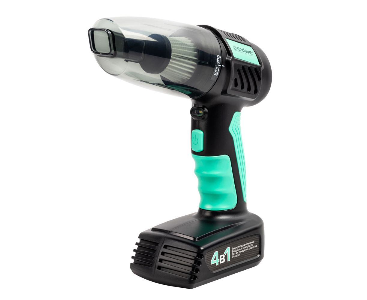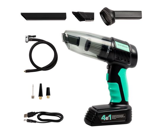 Время работы пылесоса: 20 мин, Время работы компрессора: 40 мин, Время зарядки: 2.5 ч, Скорость накачивания: 20 л/мин., 4 в1: аккумуляторный пылесос, светодиодный фонарик, компрессор, датчик измерения давления, 5 автоматических режимов компрессора: мяч, велосипедные шины, мотоциклетные шины, автомобильные шины, шины для пикапов, Переключаемая единица измерения: PSI, BAR, KPA, кг/см², Прорезиненная мягкая ручка, Высокоскоростной двигатель, Моющийся съемный контейнер для сбора пыли и воды