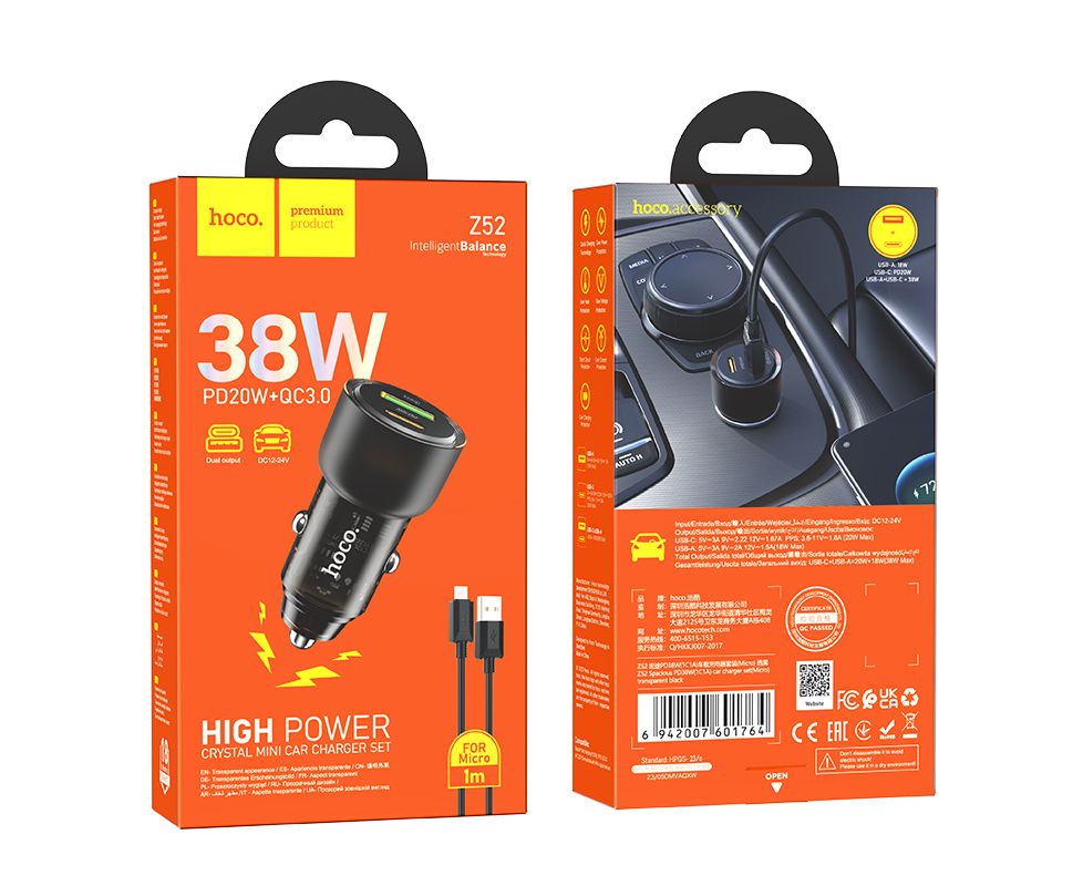 АЗУ Hoco Z52 – это современное автомобильное зарядное устройство, предназначенное для быстрой и эффективной зарядки мобильных устройств. Оно оснащено одним USB-портом и одним портом Type-C, поддерживающими технологии быстрой зарядки PD3.0 и QC3.0 с общей мощностью до 38 Вт. Это позволяет заряжать устройства с разъемами micro USB и Type-C максимально быстро и безопасно. АЗУ Hoco Z52 – это идеальное решение для тех, кто ценит скорость и надежность зарядки своих мобильных устройств в автомобиле.