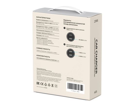 "Автомобильное зарядное устройство BREAKING A05 выполнено из ABS-пластика. Модель рассчитана на входное напряжение 12-24V и обеспечивает выходную мощность до 40W и выходной ток до 3.0A. Два разъема USB-C позволяют заряжать одновременно два устройства. На устройстве имеется небольшой световой индикатор отображающий состояние заряда подключенной к нему техники. Модель поддерживает стандарт быстрой зарядки Power Delivery, а так же функции защиты от перегрузок и короткого замыкания.