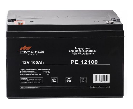 Батарея аккумуляторная Prometheus (100 Ач; 12 В) Prometheus energy PE12100 подходит для использования как в буферном, так и в циклическом режимах работы. Рекомендована для применения в переносных и портативных приборах. За счет стабильно высокой однородности внутреннего сопротивления прекрасно подходит для использования в источниках резервного энергоснабжения и блоках резервного питания.
