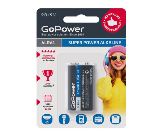 Щелочные батарейки универсального назначения GoPower SUPER POWER ALKALINE – это максимум энергии надолго и № 1 в России по соотношению «цена – качество». Благодаря новейшей технологии Powerlock и использованию премиальных компонентов из Японии, достигается минимальный саморазряд, поэтому батарейки GoPower SUPER POWER ALKALINE работают дольше и хранятся 10 лет без потери характеристик. Они идеально подходят для большинства современных устройств, включая гаджеты и устройства с высоким энергопотреблением. Батарейки безопасны для окружающей среды, так как не содержат примеси тяжелых токсичных металлов - свинца, кадмия и ртути.
