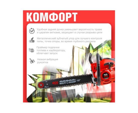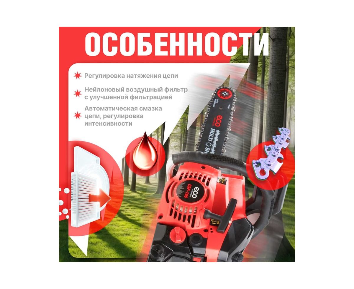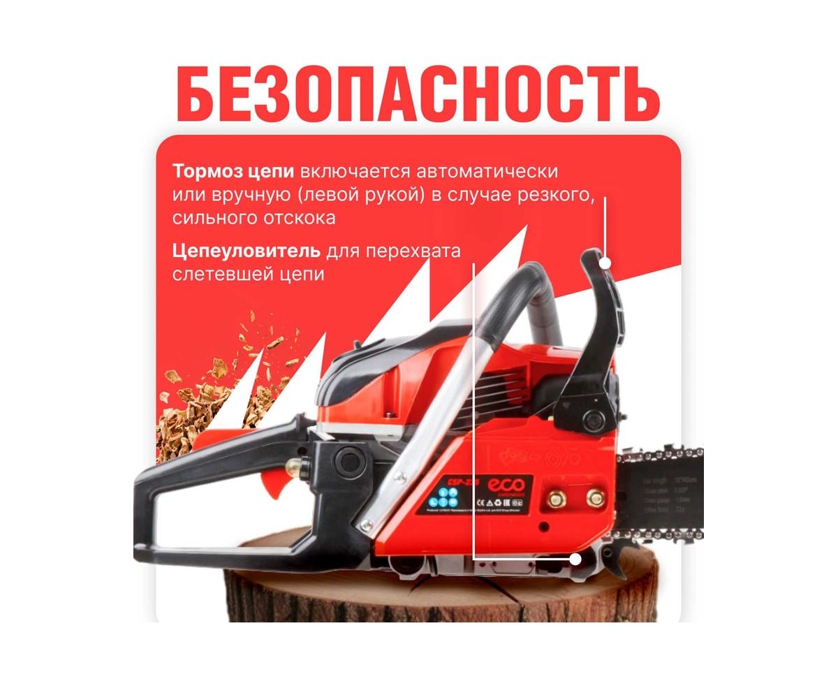 Удобно расположенные топливный насос (праймер) и винт натяжения цепи; хорошо сбалансированная конструкция; полноценный комплекс безопасности – инерционный тормоз, уловитель цепи, защита от случайного включения; антивибрационная система; автоматическая подача масла на трущиеся элементы пильной части.