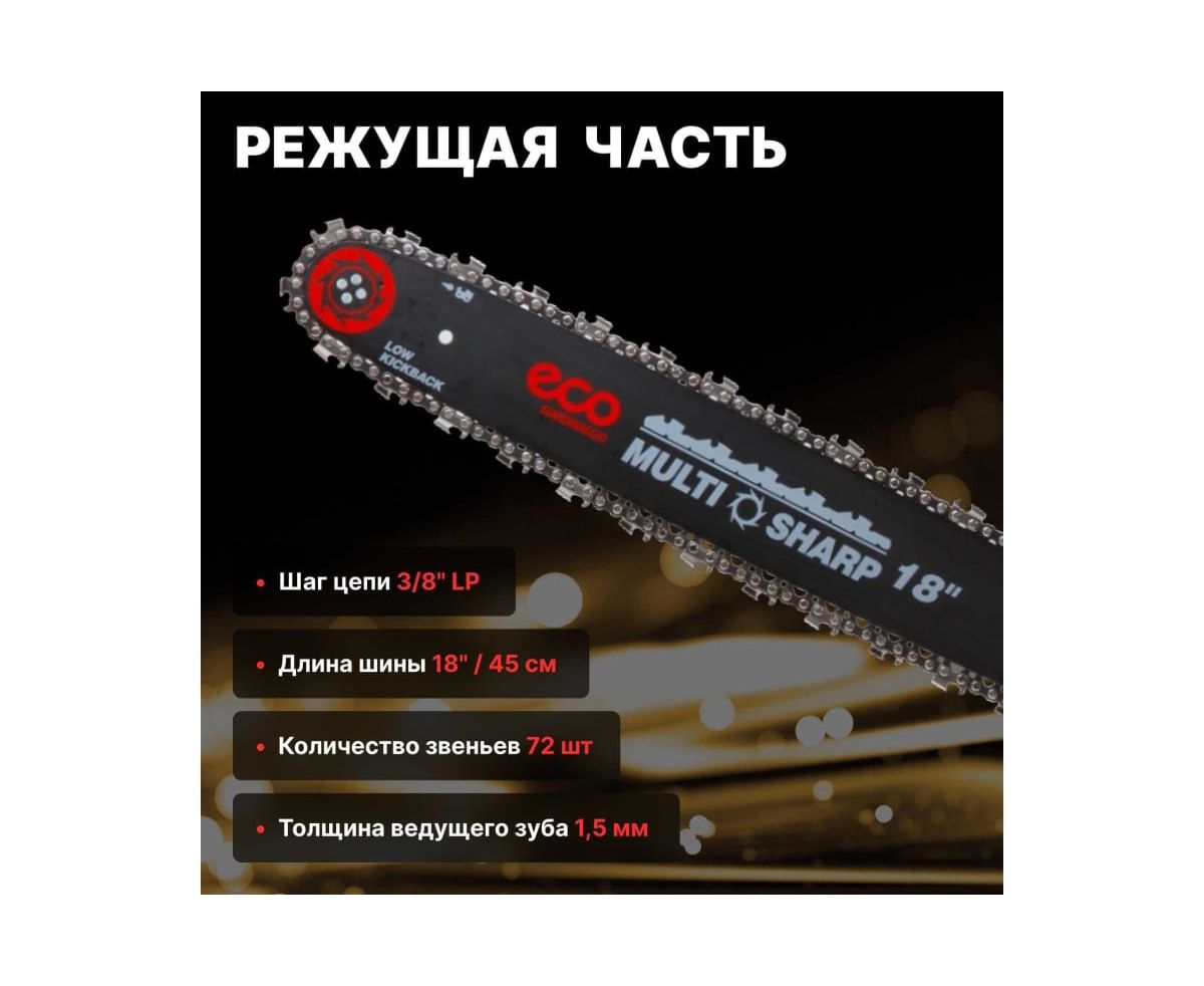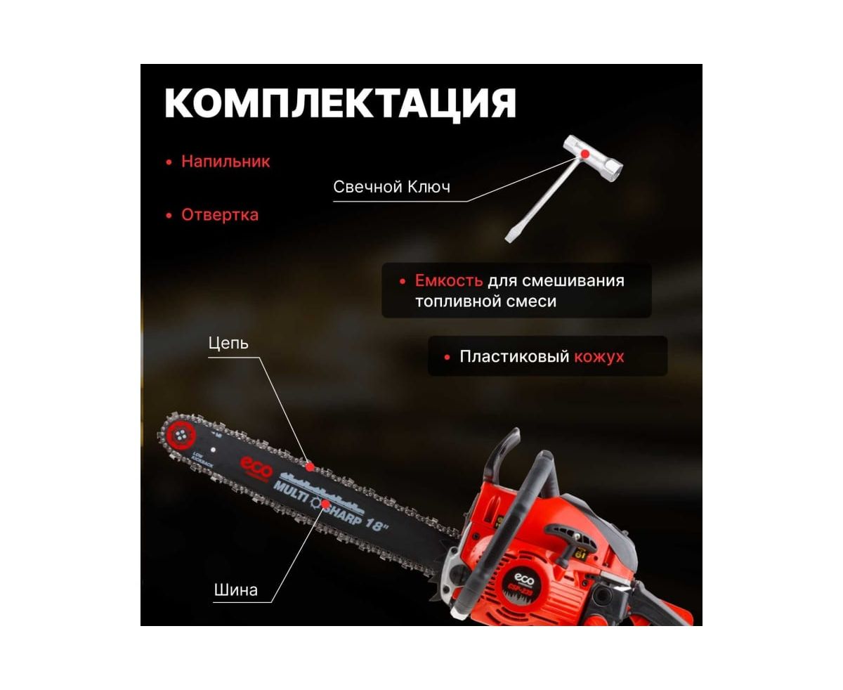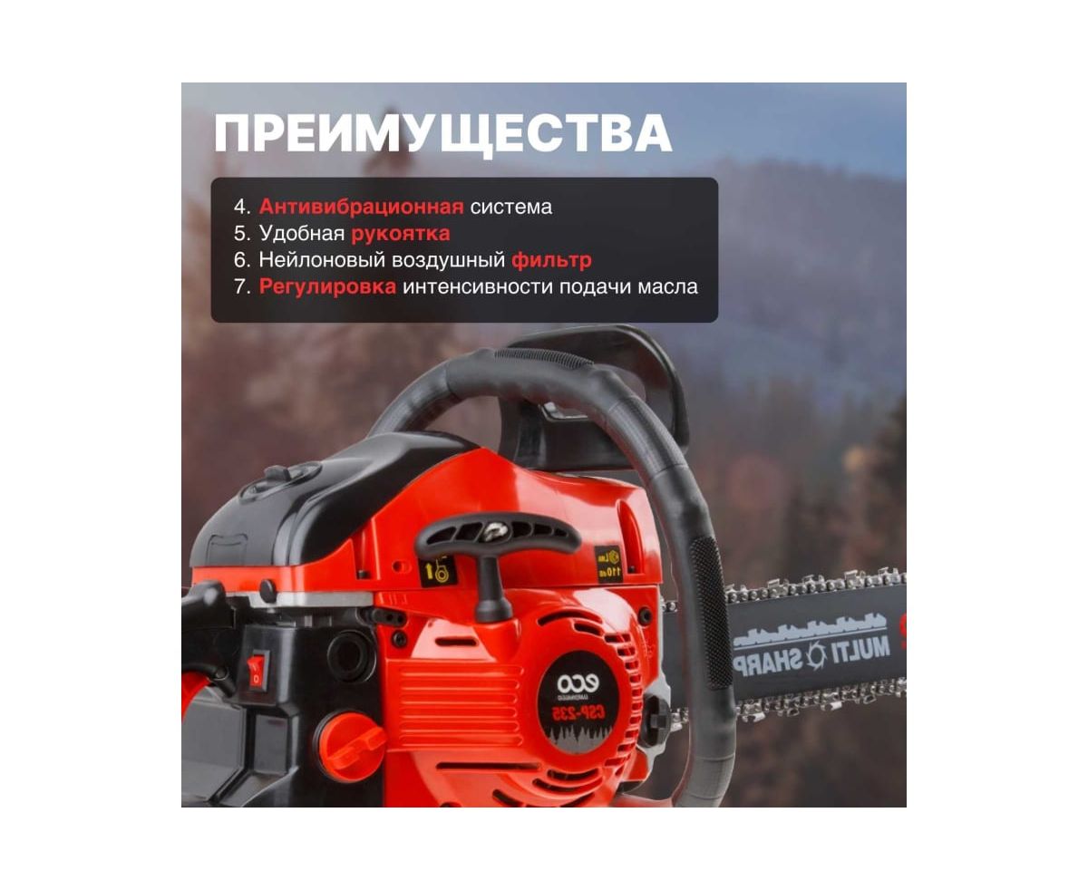 Бензопила ECO CSP-235 - это универсальный инструмент для пиления и валки деревьев, заготовки дров.