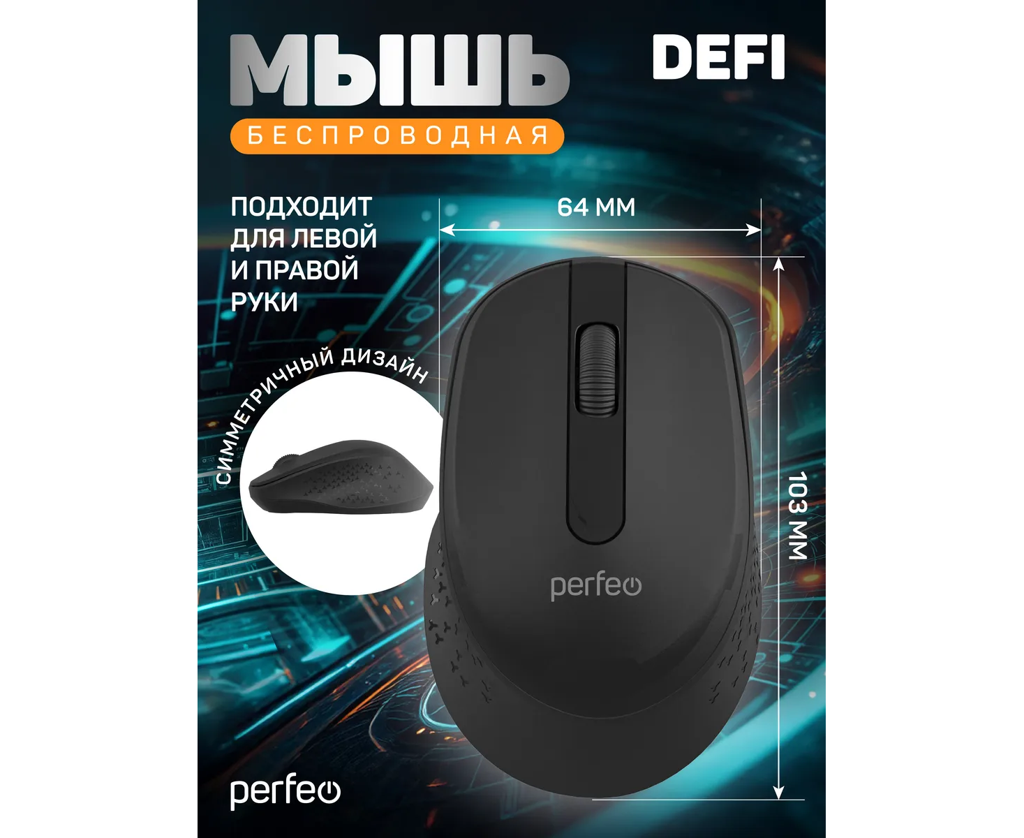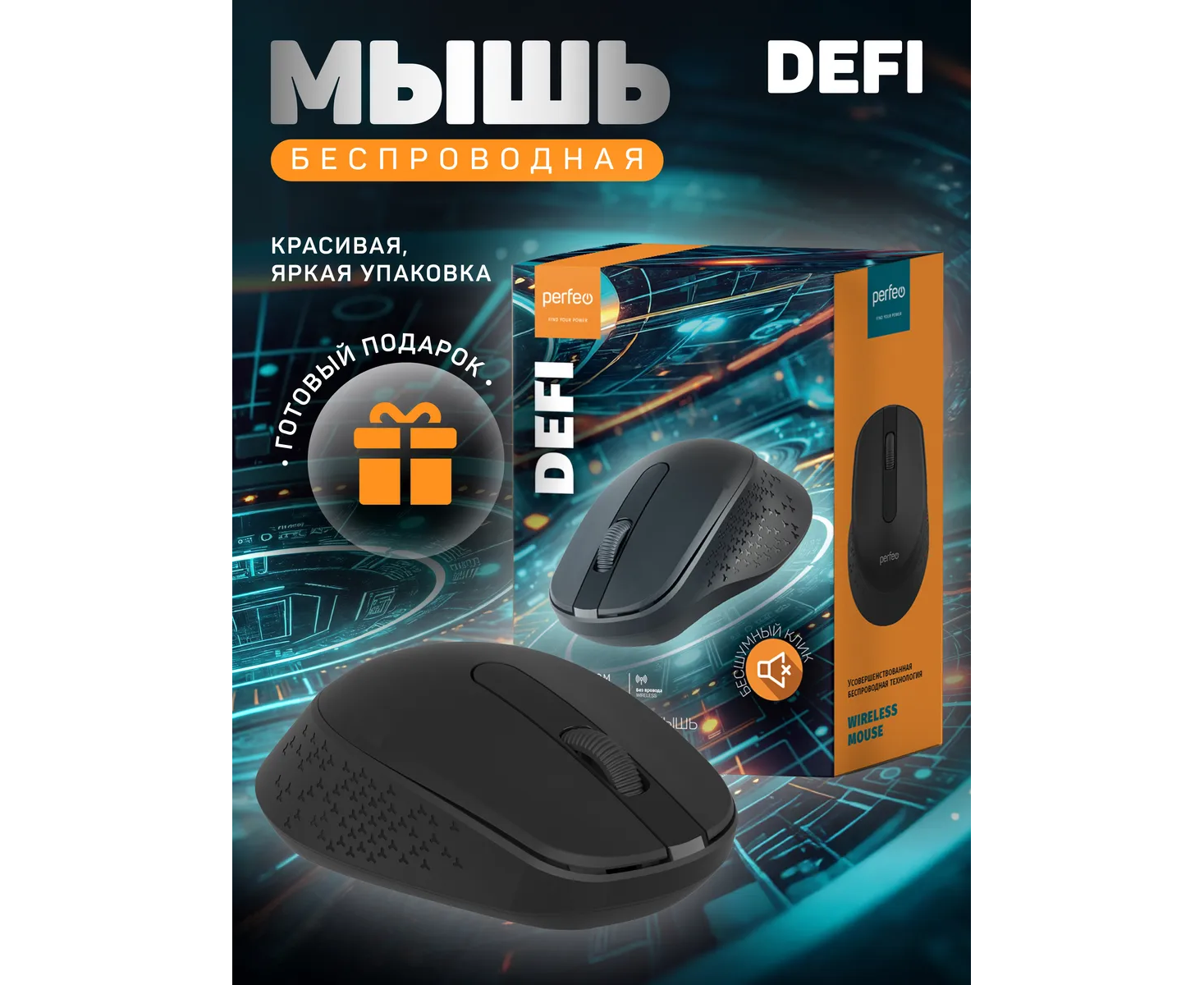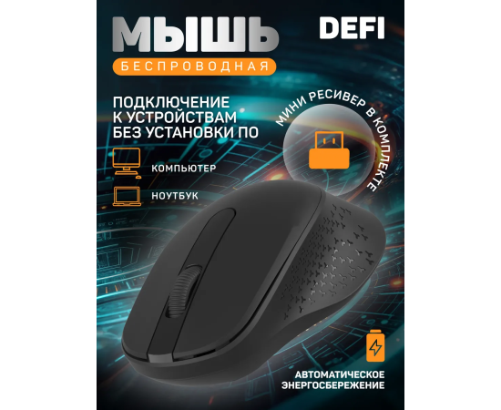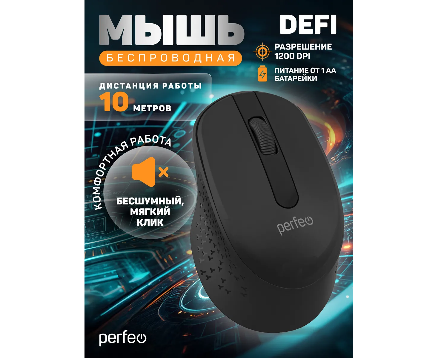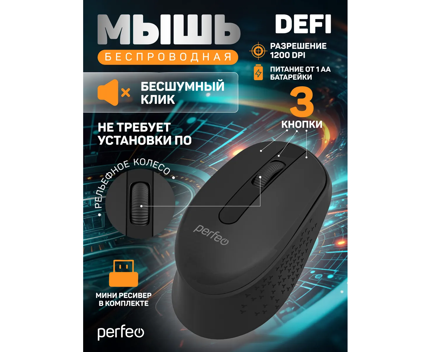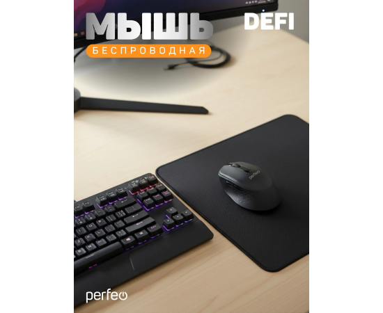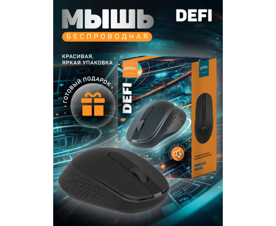 Модель Perfeo мышь беспров., оптич. "DEFI", бесшумная, 3 кн, DPI 1200, USB, чёрн.