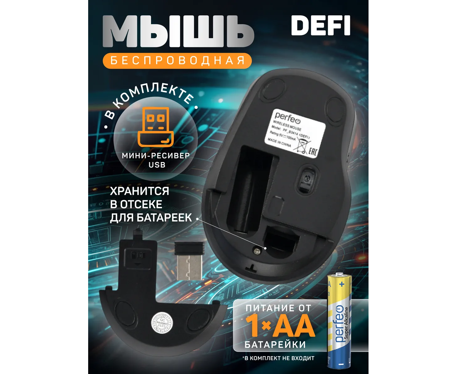 Беспроводная оптическая мышь для компьютера Perfeo DEFI подходит для повседневного использования в офисе и дома. Мышка имеет современный эргономичный дизайн. Удобная эргономичная форма мышки хорошо лежит в руке. Это делает использование более комфортным и продолжительным, рука не устает. Бесшумный клик позволяет работать в любое время суток. Колёсико -кнопка рифленое обеспечивает комфортный скроллинг плавный и без рывков. Высокоточный сенсор с разрешением 1200 DPI позволяют использовать в любых приложениях – игра, рисование или простая работа. Конструкция мышки простая и надёжная, что обеспечит долгий срок службы. Беспроводная мышка работает по радиоканалу на частоте 2,4 ГГц, передатчик идет в комплекте находится в батарейном отсеке. Радиус действия до 10 метров. Работает от одной батарейки АА (в комплект не входит). Батарейка расходуется экономично и е хватает на долгий срок, благодаря встроенной функции энергосбережения. Оптический сенсор мыши позволяет работать практически на любой поверхности. Мышка подходит для ноутбука и стационарных компьютеров. Системные требования: Windows 11/10/8/7/XP, Mac OS, свободный порт USB. Размеры: 103 х 64 х 38 мм