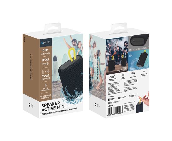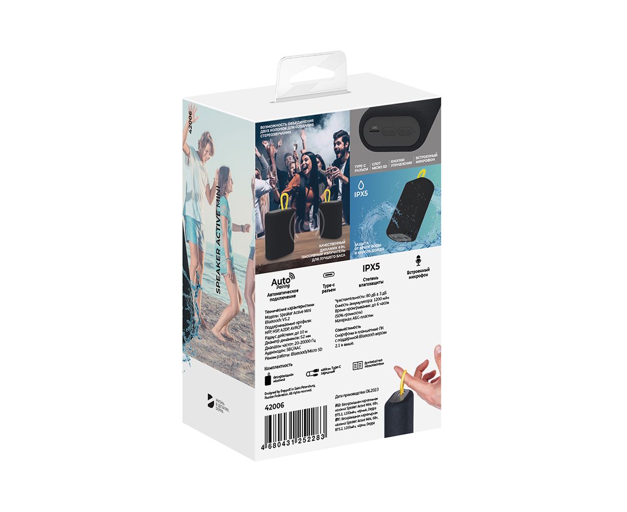Беспроводная портативная колонка Speaker Active Mini, 2х6Вт, BT5.2, 1200 мАч, черный, Deppa, 42006