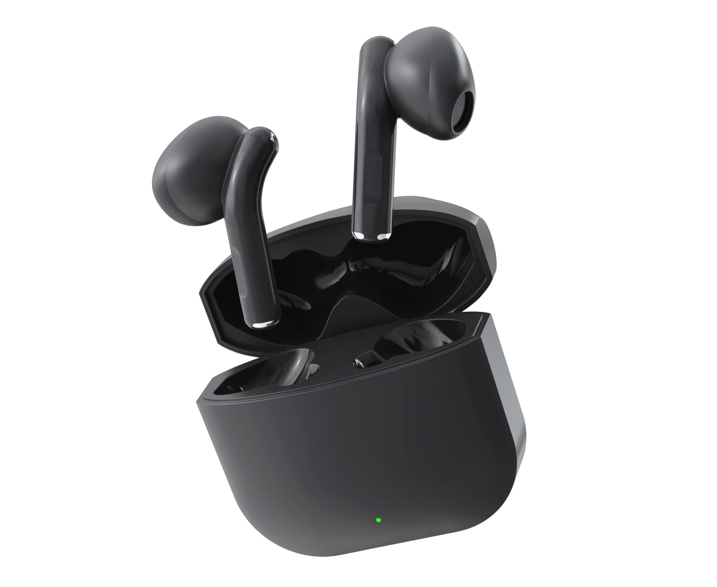 Устройство выполнено из матового пластика черного цвета. Радиус действия у данной модели - 15 метров. Кейс поддерживает функцию беспроводной зарядки, кабель USB C входит в комплект.
