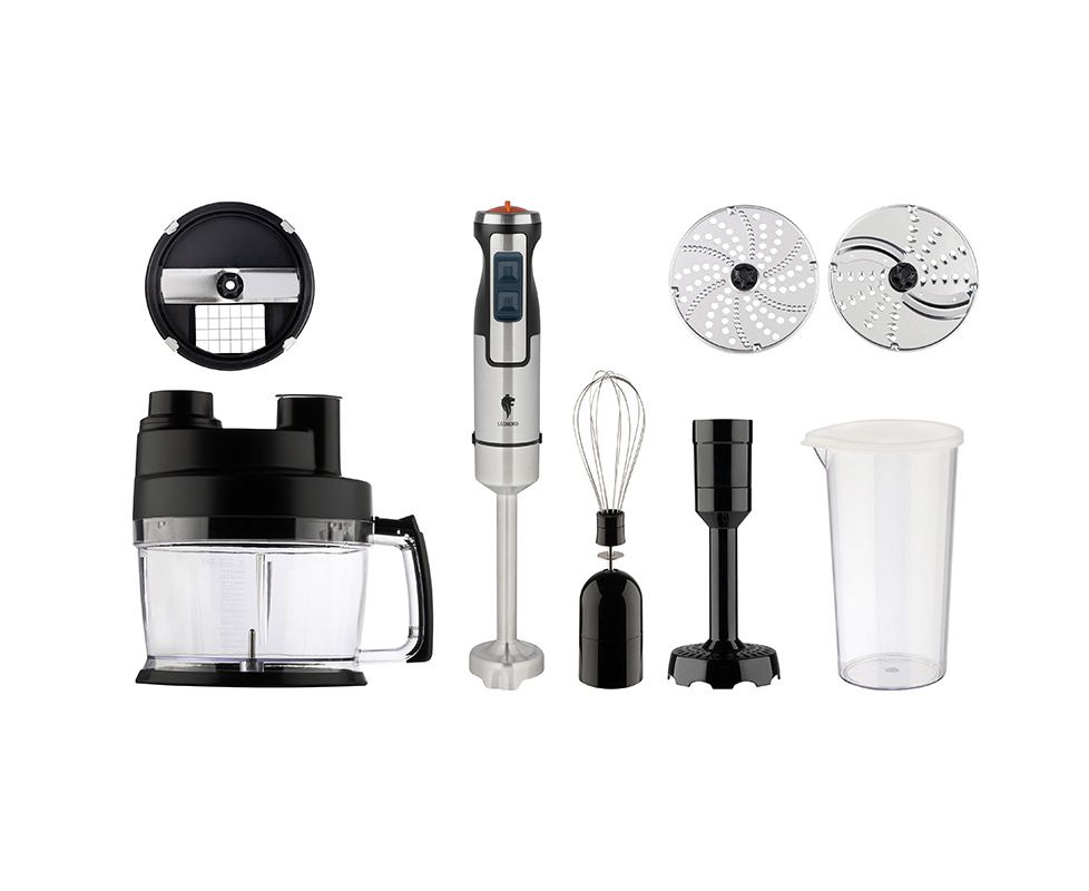 Комплектация: блендер + кубикорезка объемом 2 л с сеткой 1шт 10х10 мм + картофелемялка + венчик +мерный стаканчик на 600 мл с крышкой + два диска + насадка-измельчитель