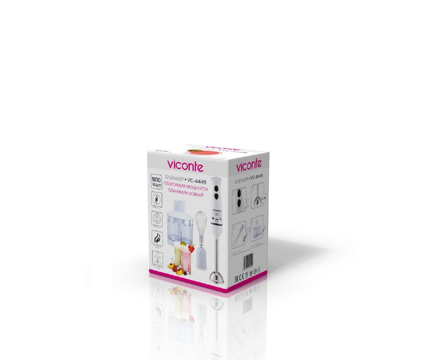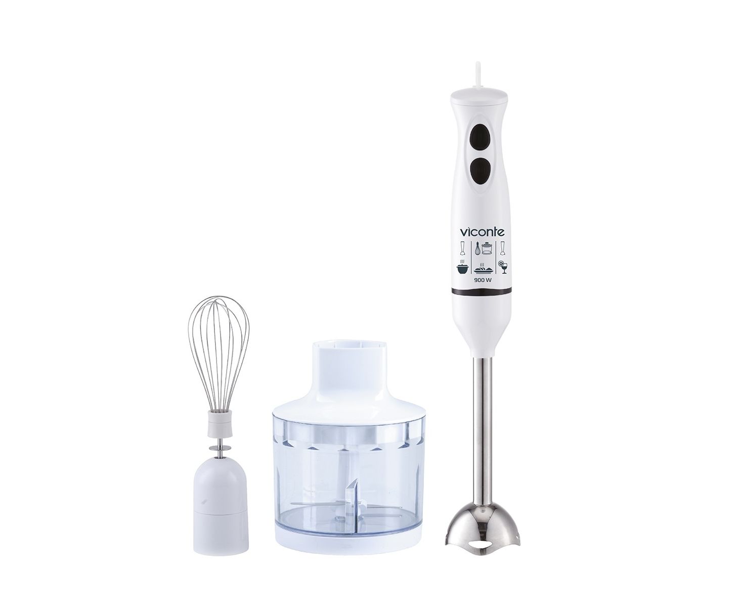 Погружной блендер Viconte VC4449 900 W, Погружной блендер, мощность 900 W, современный эргономичный дизайн, пульсовый режим работы, 2 скорости, лезвия из нержавеющей стали, металлическая нога блендера, венчик для взбивания, чаша с ножом для рубки и измельчения, 500 мл; автоматическая блокировка при неправильно установленной насадке, удобство и простота в обращении и чистке.