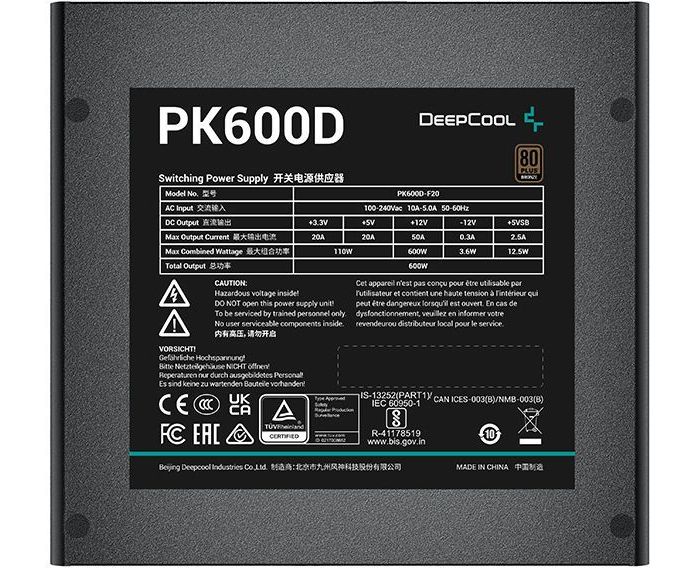 Блок питания Deepcool PK600D (R-PK600D-FA0B-EU) ATX 600W 80+ bronze (20+4pin) APFC 120mm fan 6xSATA RTL