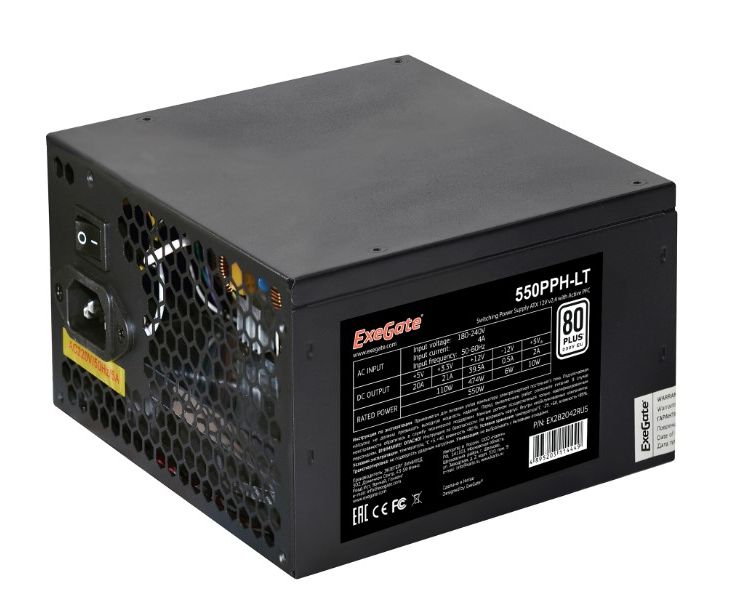 Блок питания ExeGate 550PPH-LT-OEM EX282042RUS-OEM 550W, 80+, ATX, black, APFC, 12cm, 24p, (4+4)p, 5*SATA, 3*IDE