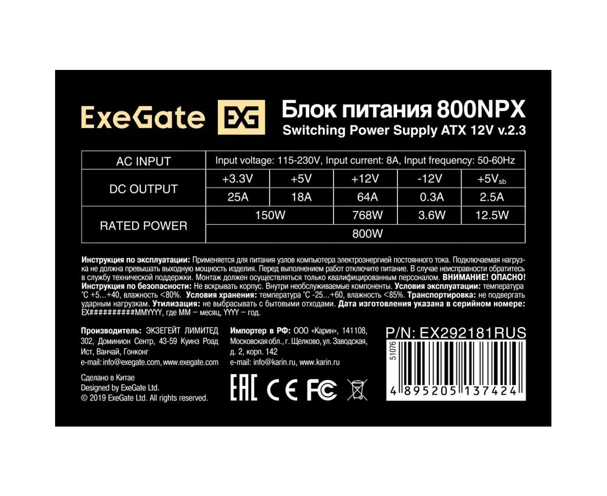 Блок питания ExeGate 800NPX EX292181RUS-PC 800W (ATX, PC, 12cm fan, 24pin, 2x(4+4)pin, 2xPCI-E, 5xSATA, 3xIDE, black)