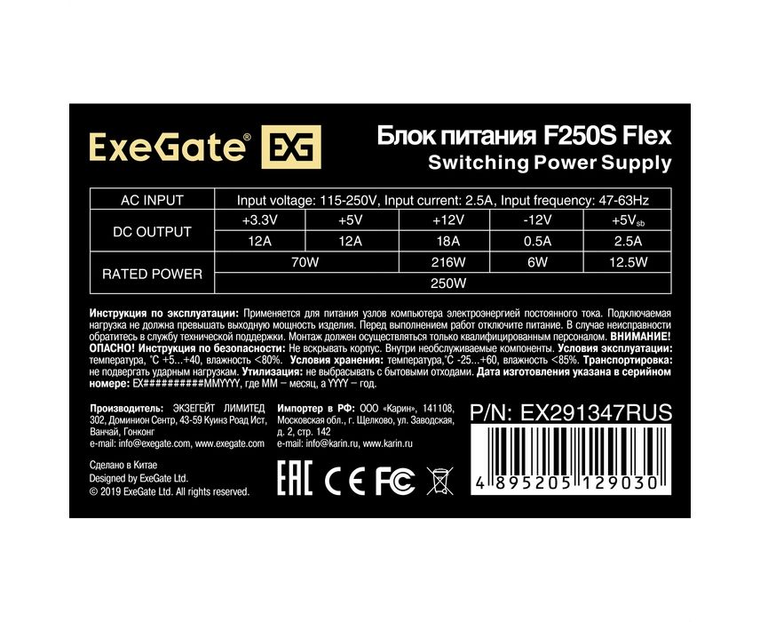 Блок питания ExeGate F250S EX291347RUS 250W (Flex ATX, for ITX case, 4cm fan, 20+4pin, 4рin, 3xSATA, 2xIDE)