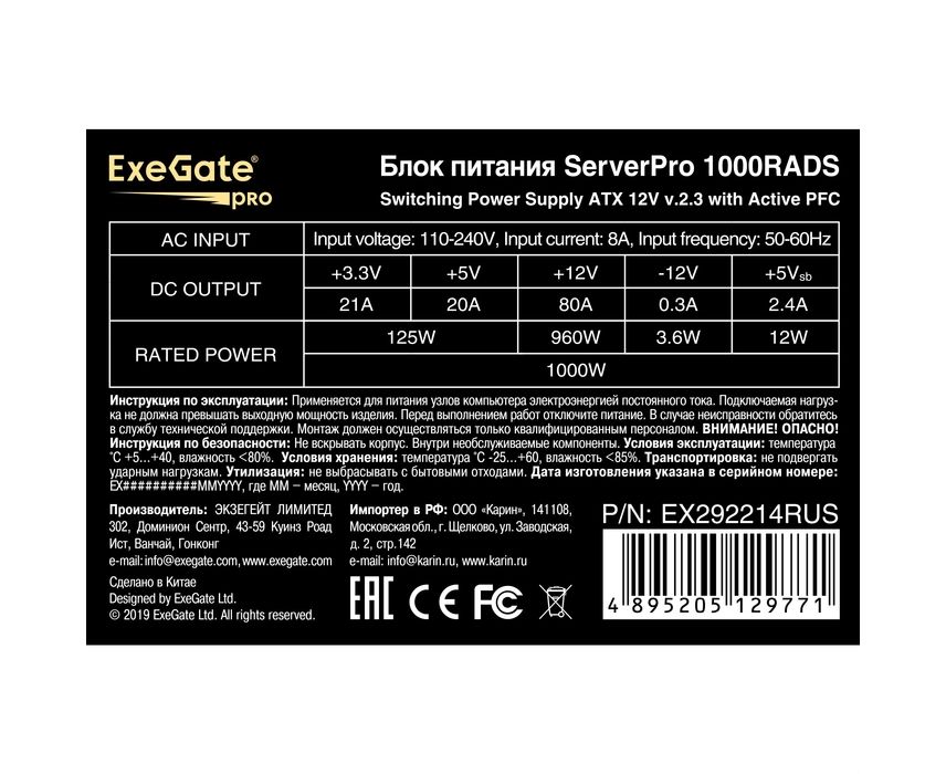 Блок питания ExeGate ServerPRO-1000RADS EX292214RUS 1000W (ATX, for 3U+ cases, APFC, КПД 82 (80 Plus), 14cm fan, 24pin, 2(4+4)pin, PCIe, 5xSATA