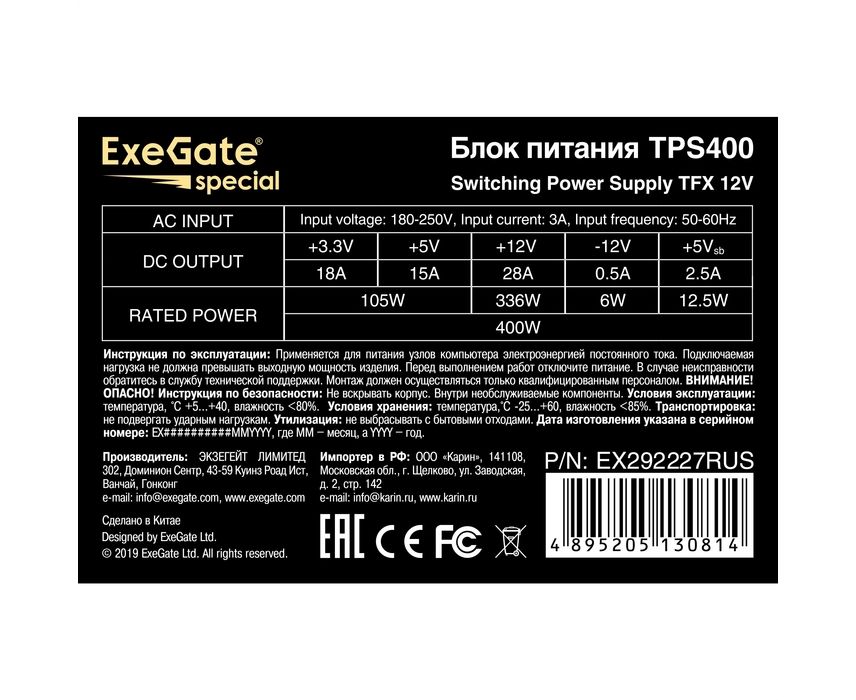 Блок питания ExeGate TPS400 EX292227RUS 400W (TFX, 8cm fan, 24pin, 4+4pin, 3xSATA, 2xIDE, black)