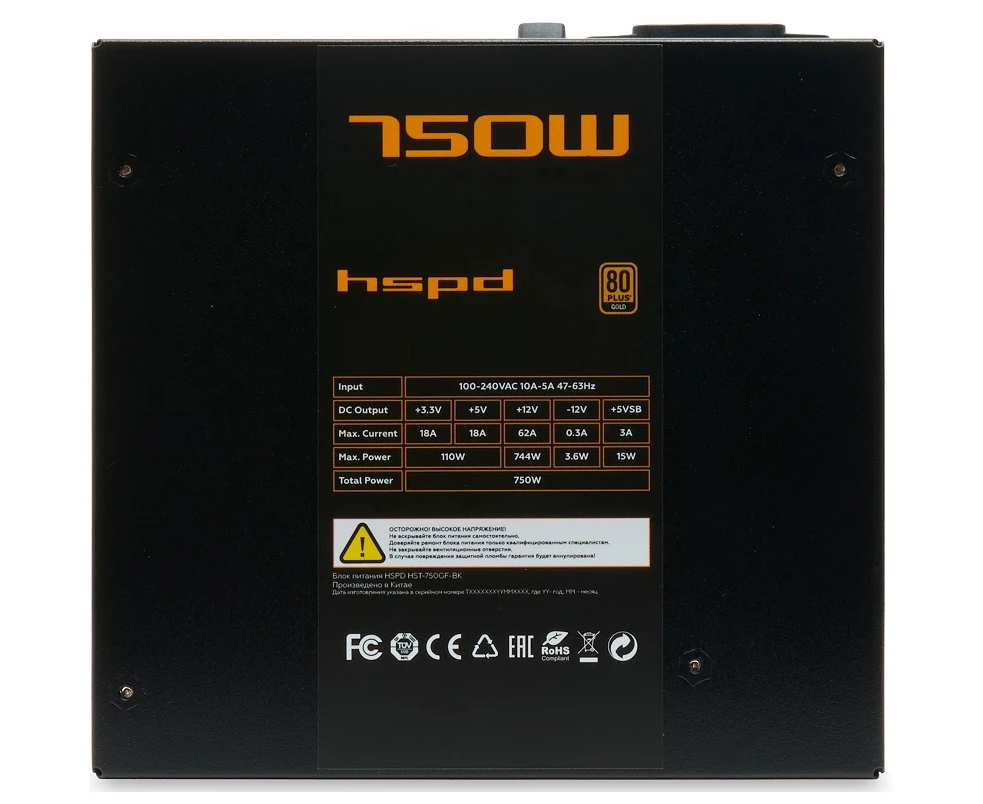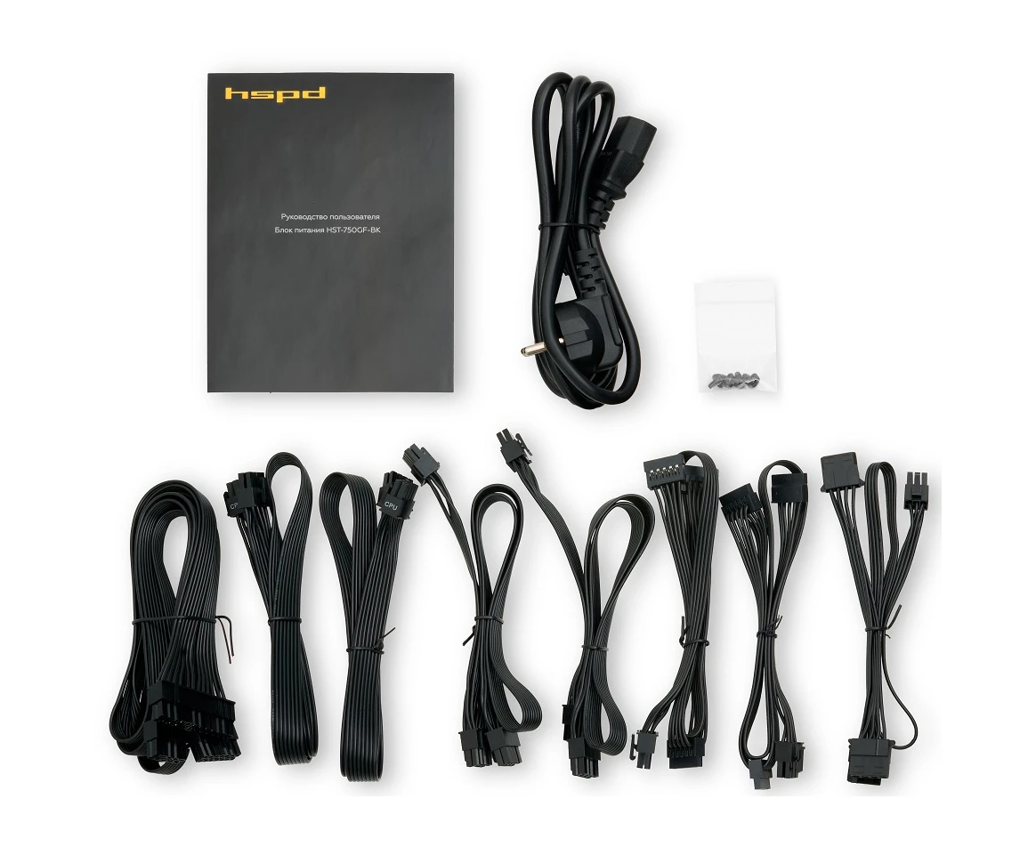 Блок питания HSPD HST-750GF-BK 750W 80+ Gold (ATX, 2.52, Full modular, 1x24(20+4)pin 600mm, 2xCPU 8(4+4)pin 700mm, 2xPCIe*2 8(6+2)pin