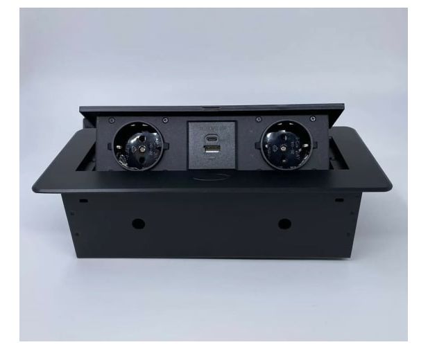 Выдвижная горизонтальная розетка, представляет собой металлический прямоугольный розеточный блок на 2 EURO, 2 USB C + A (18W).