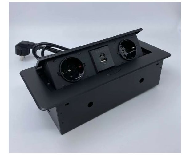 Выдвижной встраиваемый блок розеток Inrior выдвижная розетка, на 2 EURO розетки и 2 USB-A+C, черный, TORO-33-20 полностью в сборе: с внутренней проводкой, с металлической монтажной коробкой, проводом 1.8 м с вилкой. Врезное отверстие - 225х108 мм.