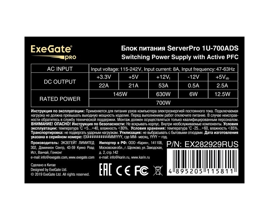 Блоки питания ExeGate ServerPro-1U-700ADS EX282929RUS 700W APFC, унив. для 1U, 24pin,2x(4+4)pin,5xSATA,4xIDE