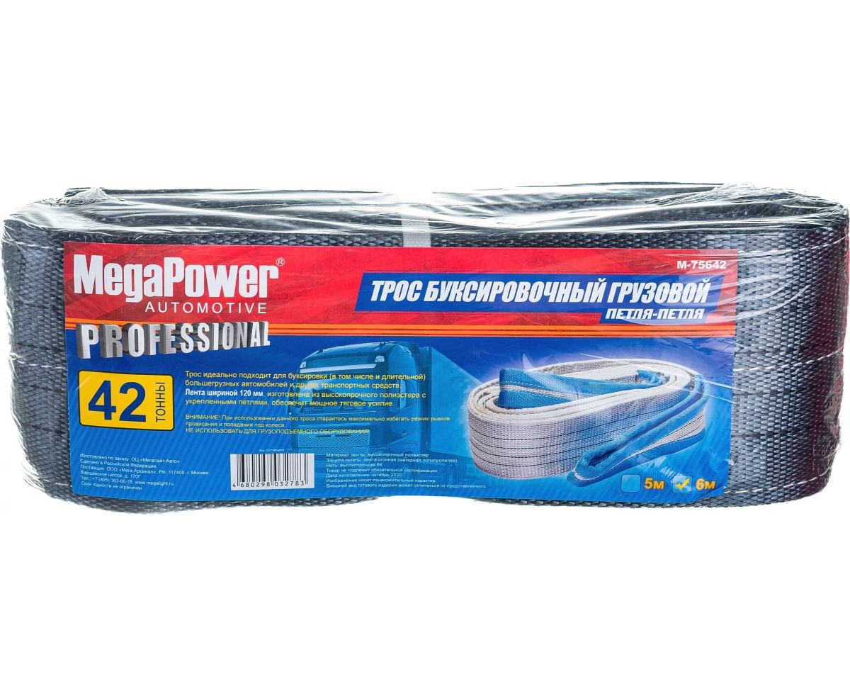 Буксировочный грузовой трос MEGAPOWER 42000кг длина 6 метров, ширина ленты 120мм петля-петля M-75642 представлен в виде прочной ленты из синтетических нитей с петлями на концах.