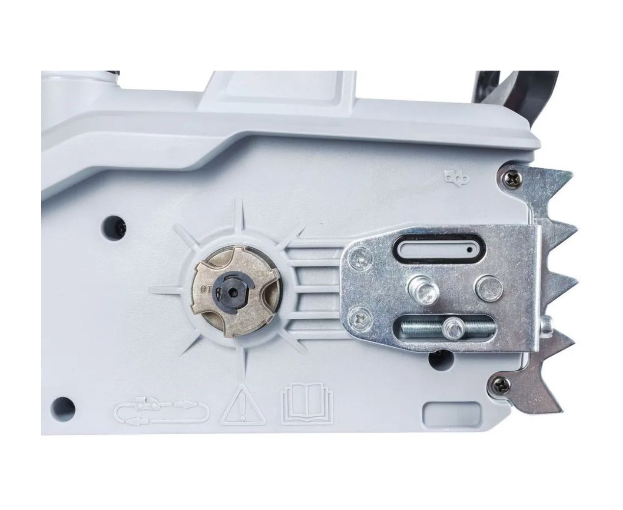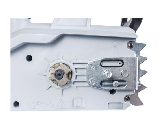Удобная задняя рукоятка небольшого размера с пусковым курком жестко сидит в руке, что способствует надежному удержанию электропилы. Автоматический тормоз цепи в виде щитка обеспечивает безопасность работы с электропилой. Заменить щетки электродвигателя можно быстро и просто за счет их расположения.