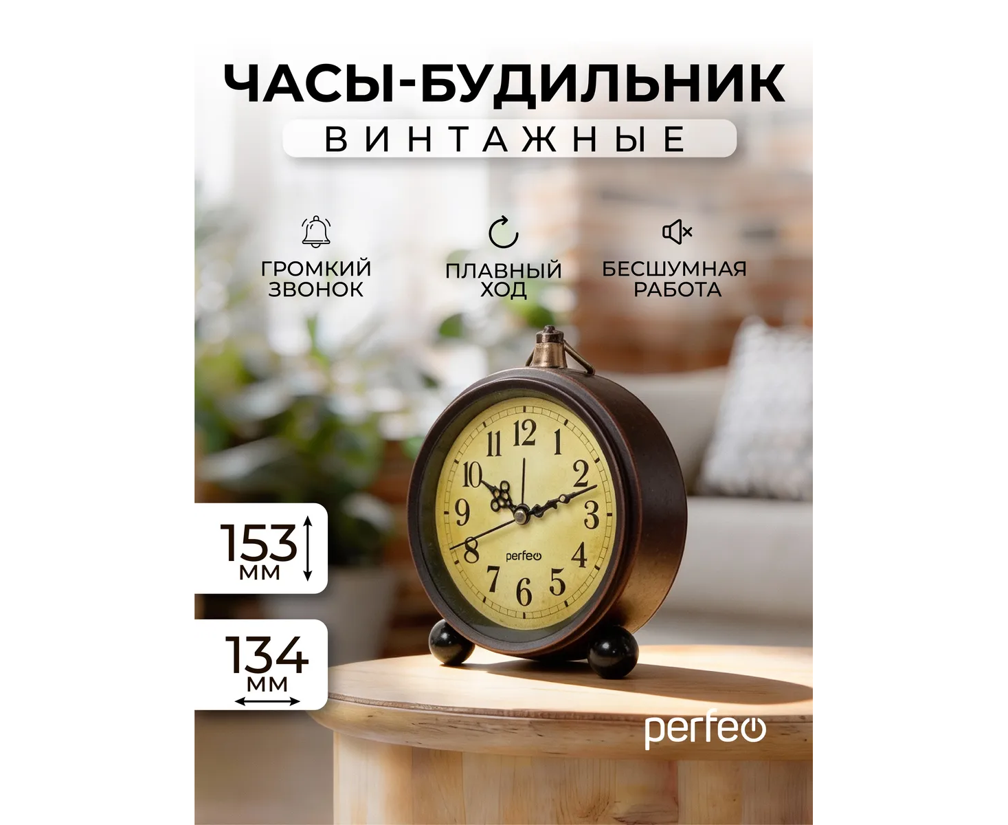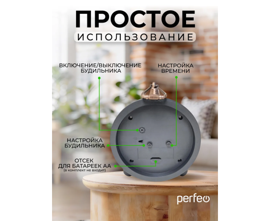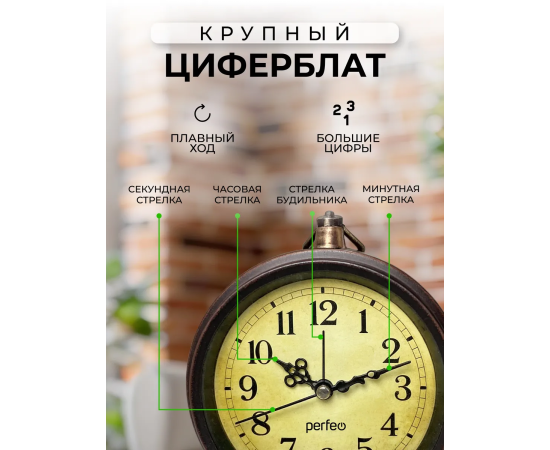 Часы-будильник Perfeo Quartz "PF-TC-033", винтажные, круглые, арабский циферблат, коричневый, (Арт. PF_C3159)