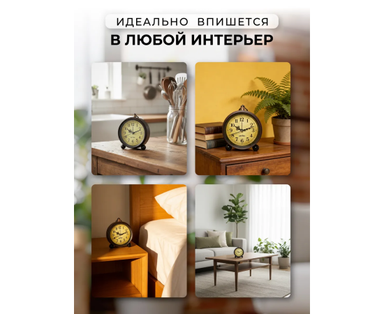 Интерьерные настольные часы с будильником и арабским циферблатом станут эффектным декором для дома. Хорошо подойдут для гостиной на каминную полку или рабочий стол. Механические часы с бесшумныем ходом в ретро стиле и громким будильником сочетают комфорт и точность: ночью не слышно, утром не проспишь. Модель работает на батарейках, остаётся надёжной и очень простой в использовании. Такой настольный аксессуар со строгим винтажным стилем и крупными стрелками и циферблатом гармонично вписывается в любой интерьер и станет идеальным подарком на 23 февраля и 8 марта.