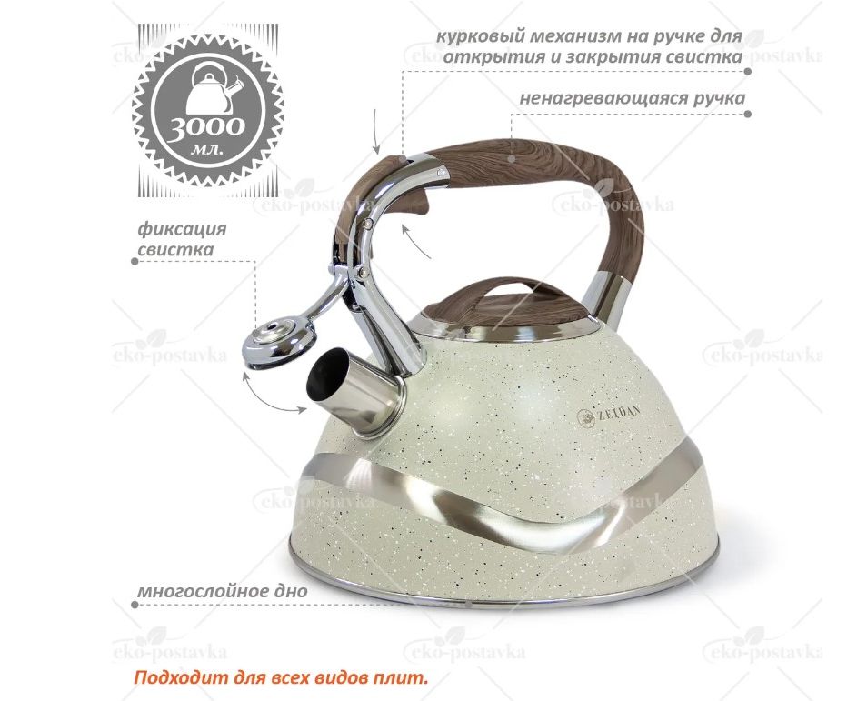 Чайник Zeidan Z-4369 объемом 3 л. Оснащен свистком, благодаря которому вы не пропустите момент закипания. Изготовлен из нержавеющей стали, капсулированное индукционное дно, курковый механизм открытия свистка. Внешнее покрытие антипригарное цветное. Устойчивое к высоким температурам. Ручка с покрытием softtouch.