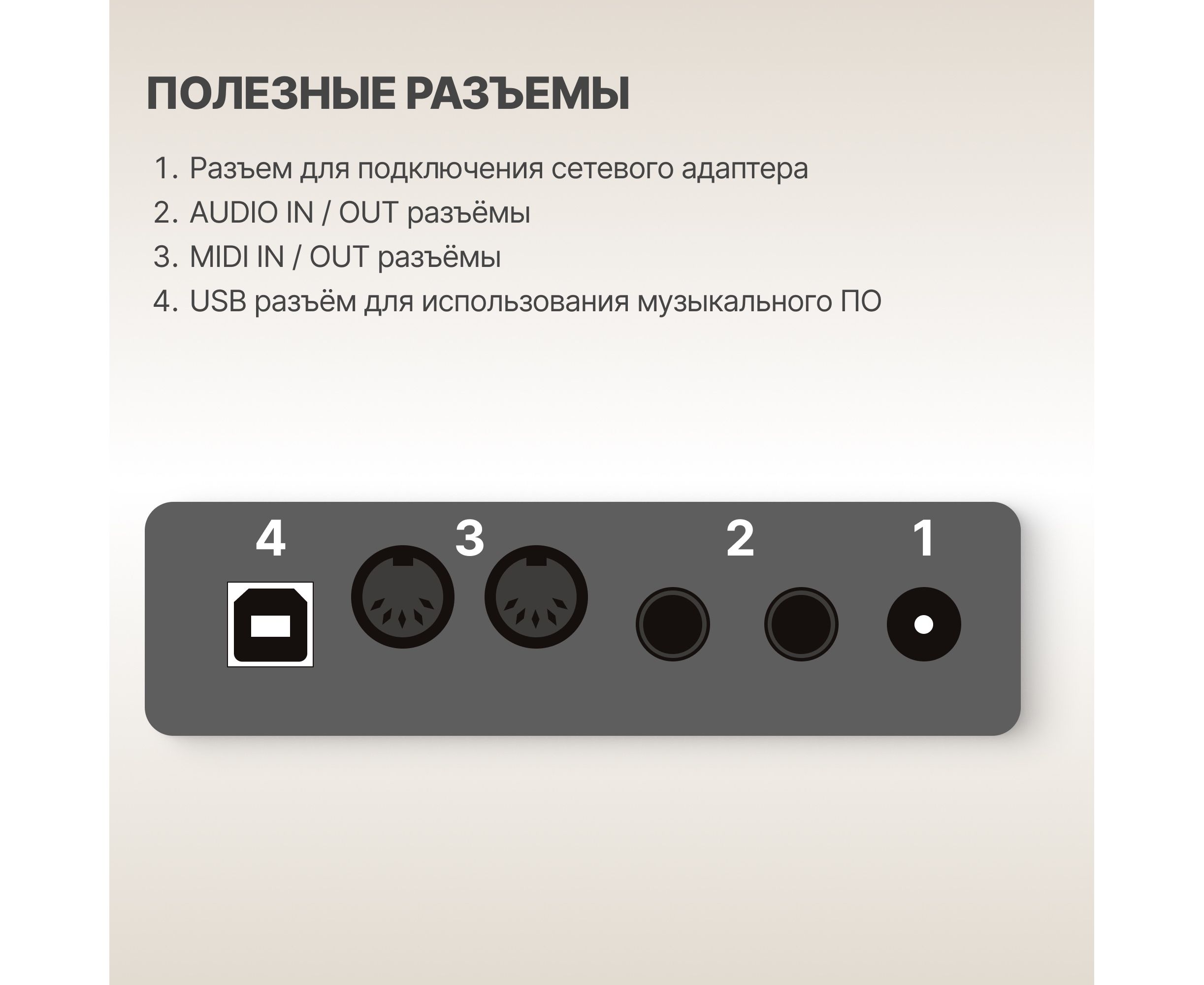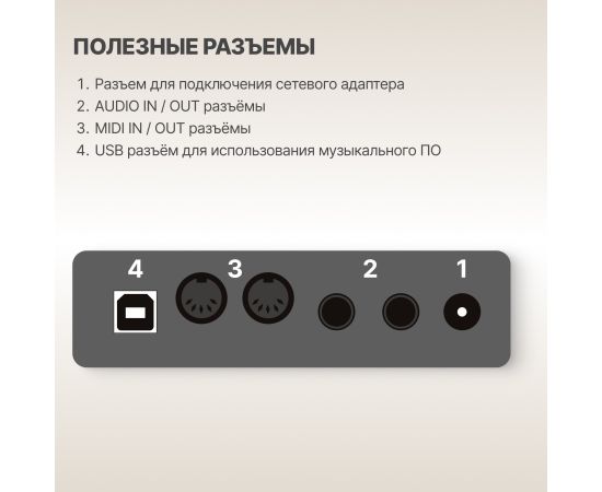 USB разъем для подключения к компьютеру и использования в качестве MIDI клавиатуры: