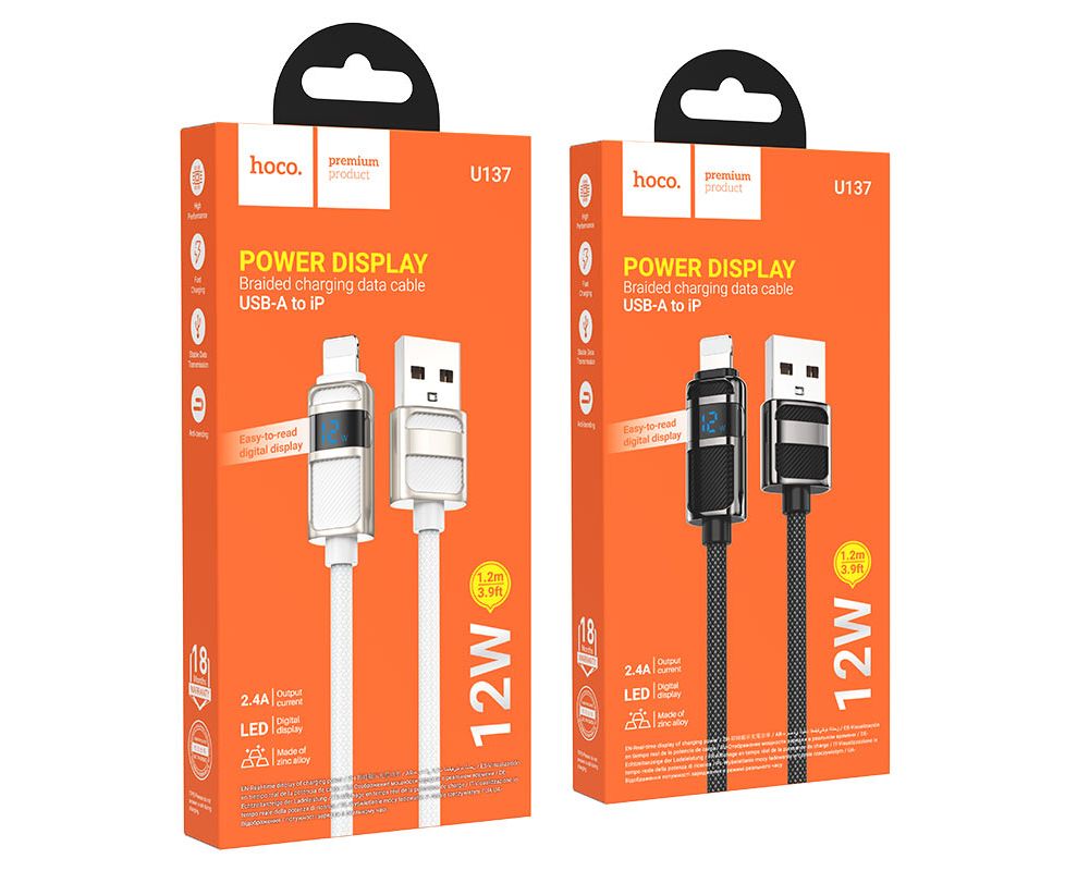 U137 Line, USB на iP зарядный дата кабель, ток до 2.4A, LED цифровой дисплей, нейлоновая оплётка и коннекторы из цинкового сплава, длина – 1.2м