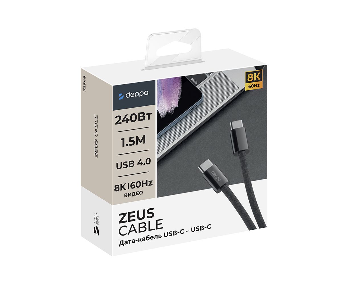 Дата-кабель Zeus, USB-C - USB-C, 1,5м, 5A, USB4, 8k60Hz, черный, Deppa, 72548
