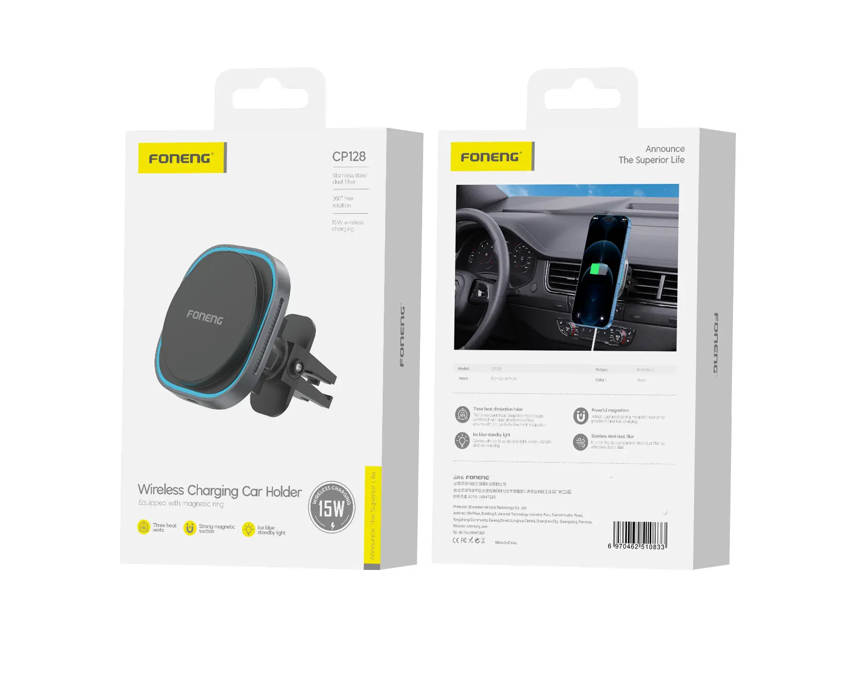 Держатель автомобильный Foneng CP128 в воздуховод, с беспроводной зарядкой 15W MagSafe (Black)