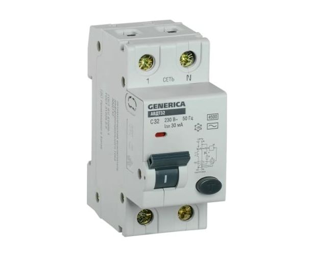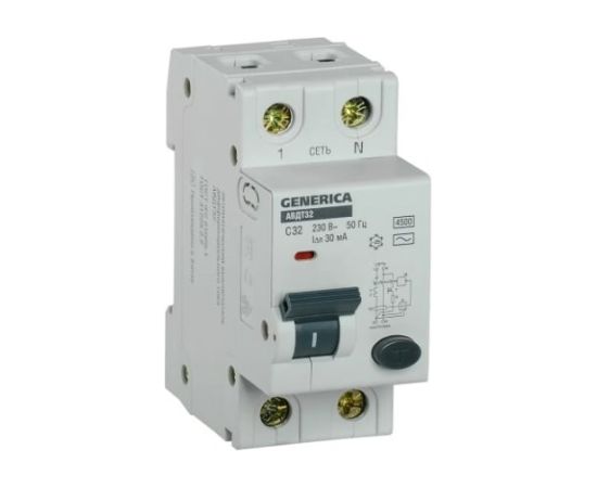 Дифавтомат IEK АВДТ 32 Generica (MAD25-5-032-C-30) 32A тип C 6kA 30мА AC 2П 230В 2мод серый (упак.:1шт)