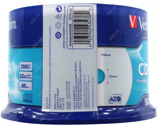 Диск CD-R Verbatim (43438) 700 Mb, 52x, Cake Box (50), DL+, Full Ink Printable (50/200)