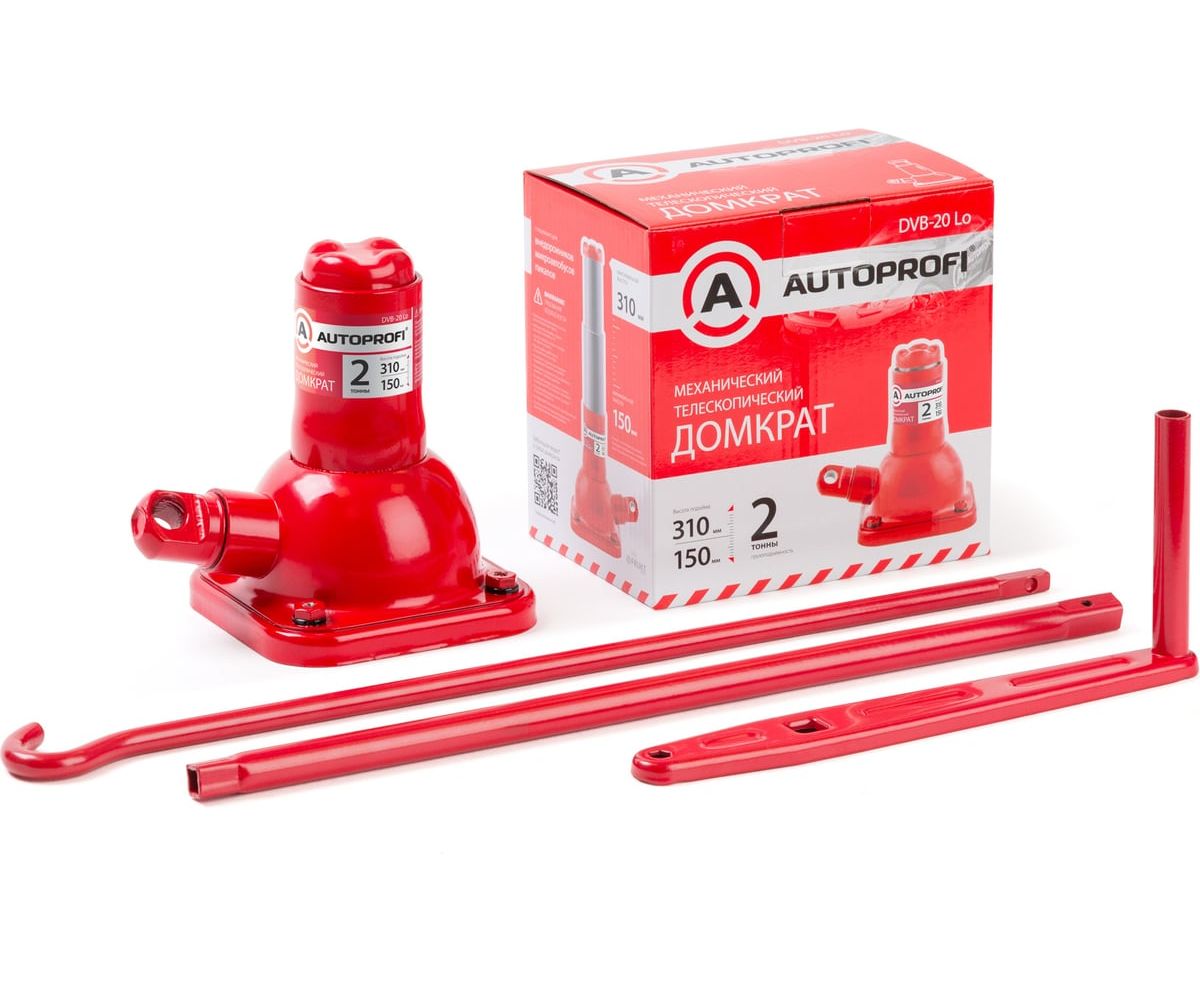 Автомобильный механический домкрат AUTOPROFI DVB-20-Lo - настоящий находка для любого владельца автомобиля. Он представляет собой компактное решение для подъема автомобилей при ремонте подвески или замене колеса, а так же является отличным выбором для использования в гараже или на шиномонтаже. Бутылочный домкрат станет незаменимым помощником при подъеме транспортного средства массой до 2 тонн. Винтовой домкрат с рабочей высотой от 150 мм до 310 мм. С домкратом можно работать, не сгибаясь. Длинный вороток дает длину рычага в 85 см. Опора у домкрата телескопическая и поднимает груз на высоту до 308 мм. Корпус домкрата стальной с антикоррозийным покрытием. Яркий красный цвет будет заметен даже в темное время суток. Тип домкрата — механический. Максимальный груз — 2 тонны. Это обеспечивает возможность поднять практически любое авто без каких-либо проблем. После подъема груза он должен быть зафиксирован на страховочных опорах (продаются отдельно). Также небольшие размеры позволяют удобно перевозить домкрат в багажнике и всегда быть под рукой. Он идеально подойдет для ремонтно-монтажных работ с автомобилем. Такой надежный домкрат станет вашим верным спутником при проведении различных работ с вашим автомобилем. Это надежный и прочный инструмент, который поможет Вам быстро решить Ваши ремонтные задачи в автомастерской, в гараже и в других местах.