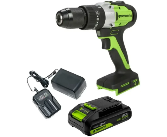 Дрель-шуруповерт Greenworks GD24DD60 (3704107CUA) ударная аккумуляторная, 24V, бесщеточная, 30/60Нм, 1х2Ач, ЗУ, кор