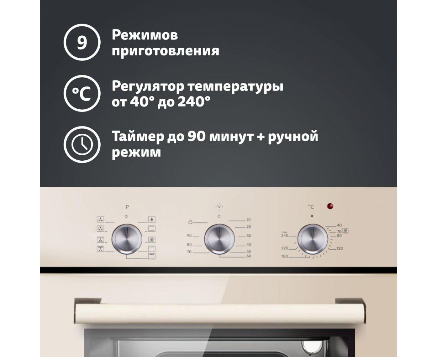 Кольцевой нагреватель + конвекция, Нижний + верхний нагрев + конвекция, Конвекция, Нижний + верхний нагрев, Верхний нагрев, Гриль, Гриль + конвекция