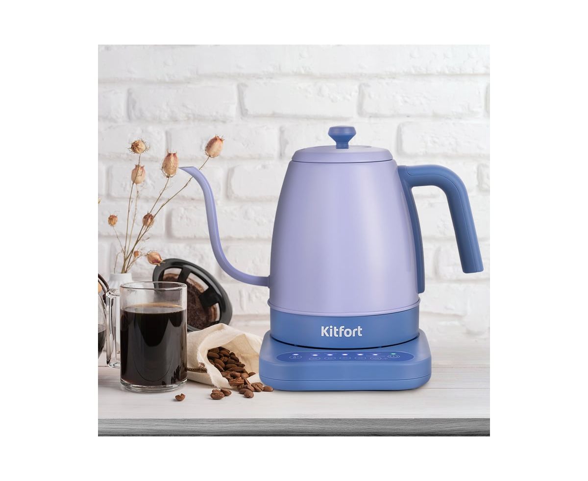 Длинный изогнутый носик чайника формирует тонкий и ровный поток воды, что является обязательным условием для приготовления кофе в кемексе или пуровере. Благодаря тонкому носику вы сможете постепенно и аккуратно добавлять воду в кофе, добиваясь равномерной экстракции. Контролировать пролив воды с помощью обычного чайника неудобно, так как широкий носик не позволяет добиться точно направленной струи воды с определенной скоростью, и в результате вкус и аромат кофе раскрывается не полностью. Корпус и крышка чайника выполнены из нержавеющей стали и пластика, а база — из пластмассы. Максимальная отметка нанесена внутри чайника. Ручка чайника пластиковая, не нагревается и удобно лежит в руке. Нагревательный элемент (ТЭН) у этой модели чайника скрытый и находится в донной части. Сверху он закрыт специальной металлической пластиной из нержавеющей стали, благодаря которой исключается прямой контакт ТЭНа с водой. Такая конструкция препятствует образованию накипи, облегчает уход и значительно снижает шум при нагревании воды. База с центральным контактом дает возможность располагать на ней чайник в любом положении, обеспечивая вращение на 360°. Управление осуществляется с помощью панели управления на базе. Чайник автоматически отключается при закипании, имеет защиту от перегрева и от включения без воды. При закипании воды образующийся пар попадает в паропровод, проходит по нему и затем воздействует на термодатчик, который отключает чайник.