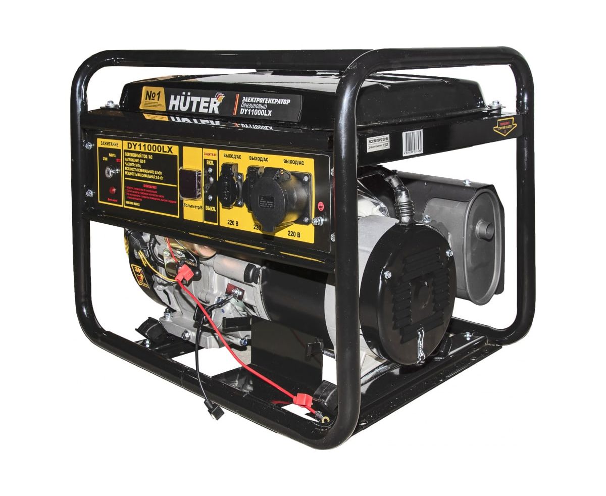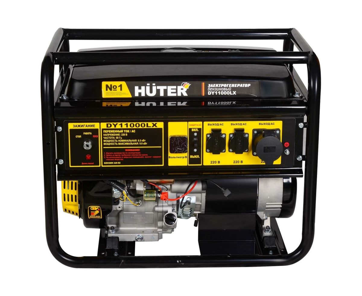Электрогенератор HUTER DY11000LX максимальной мощностью 9000 Вт оснащен бензобаком емкостью 25 л. Данный агрегат способен обеспечивать автономное электроснабжение жилых домов, сварку, несколько электроинструментов. Он позволит провести аварийно-ремонтные работы вдали от постоянных источников тока, ЛЭП и трансформаторных подстанций. Эта машина оснащена ручным стартером, осуществляющим запуск в любых условиях. Имеется также и электрический стартер, питание на который подается от АКБ (необходимо приобрести отдельно).